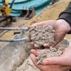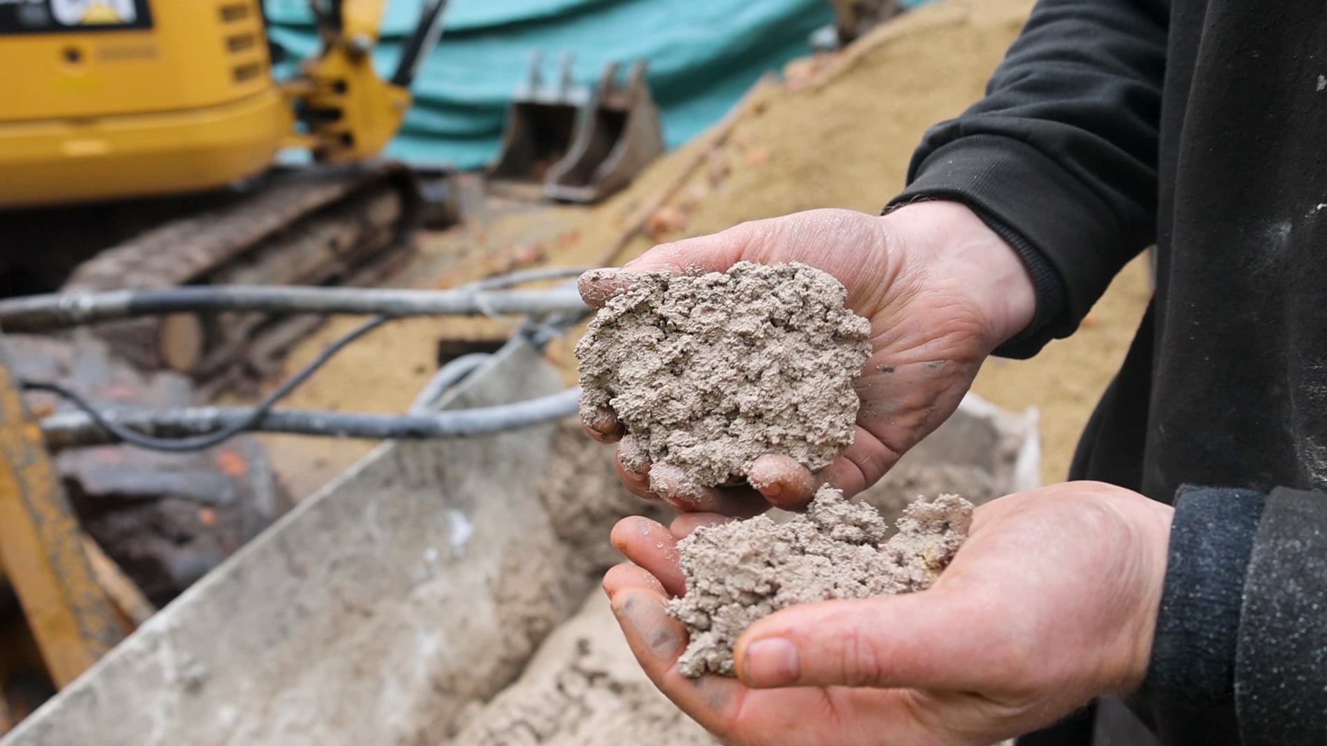 It all got merged and mixed in our big auger on site, with plenty of water poured in to bind it all together. To help with the binding, we also added synthetic fibres. The perfect mix is not as runny as concrete but still wet enough to be able to clump together. As Phil put it in the video, “it needs to be wet enough so it binds, but not too wet so it flows.”