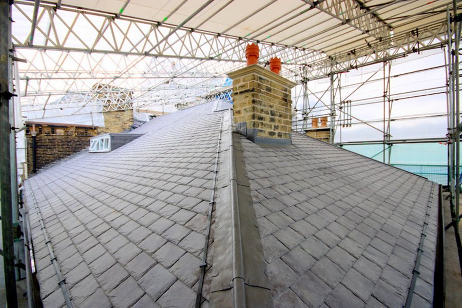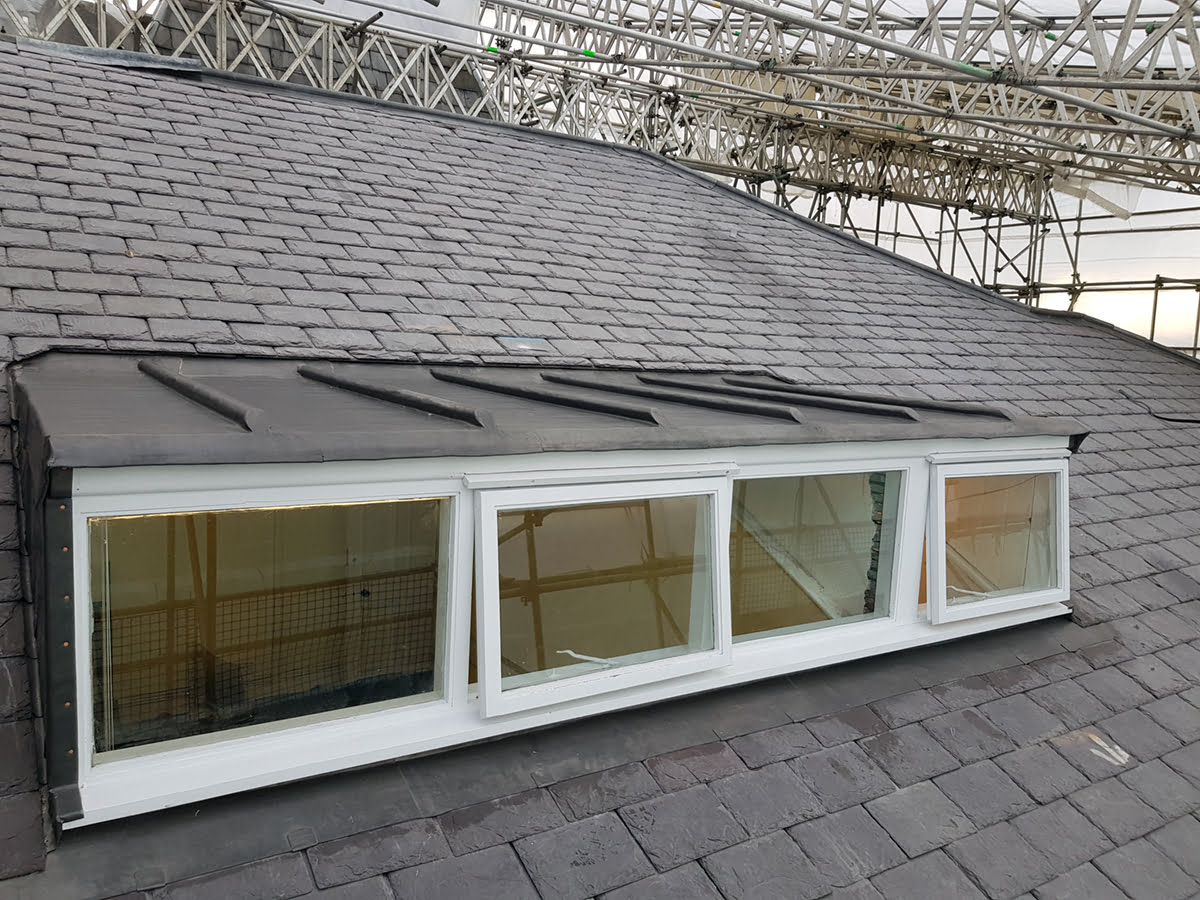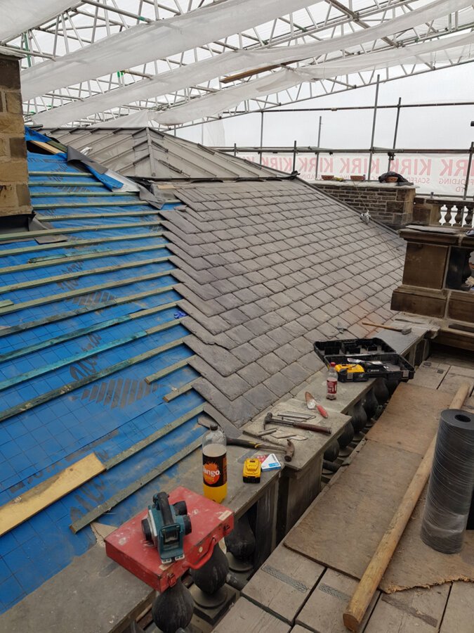Phases 1 – 4 of the restoration project at Burnley Town Hall Primarily focused on the on the repair of the slate roofs, Lead details & Stone Chimneys. The work started in January 2019 and spanned over 18 months until June 2020. Phase 3 also incorporated the restoration of the clock tower, including the replacement of the copper dome & construction of a new oak Lantern. Many sections of the roof & clock tower were over 100 years old and required immediate intervention to prevent further water ingress to the building.