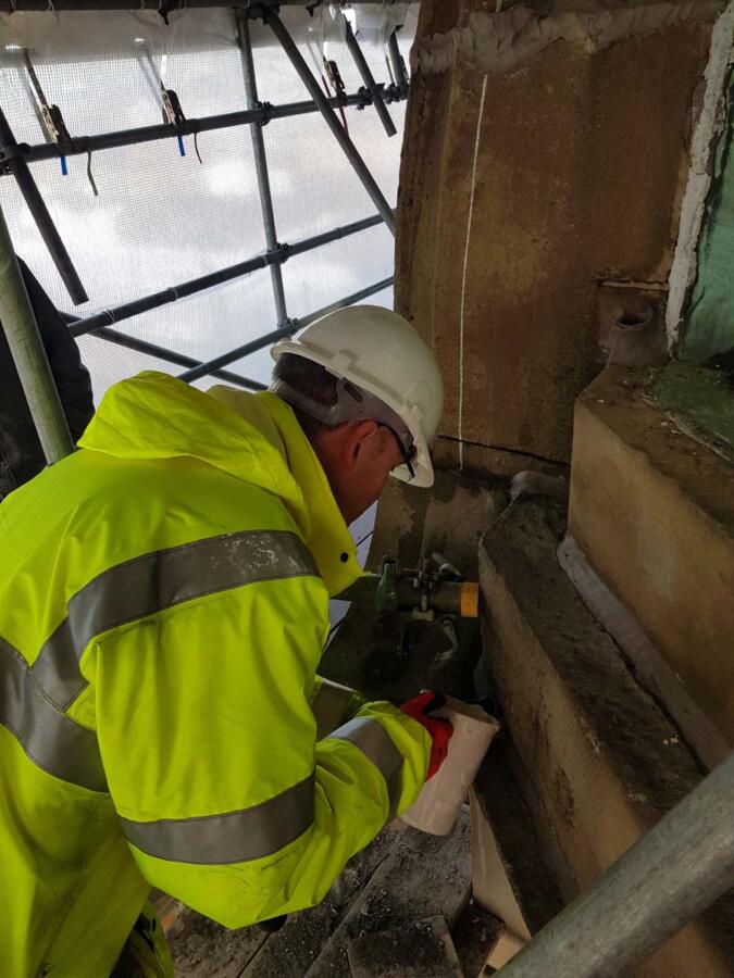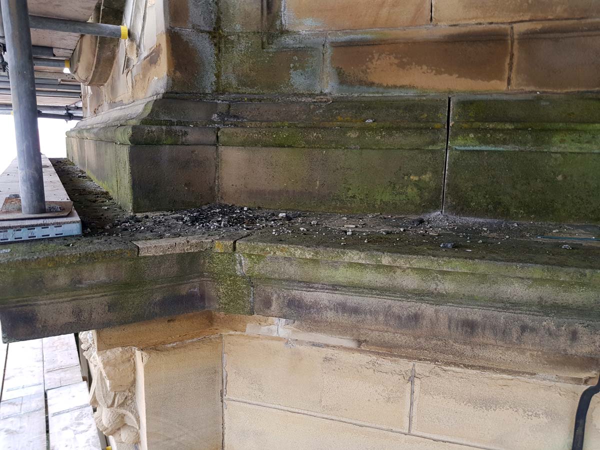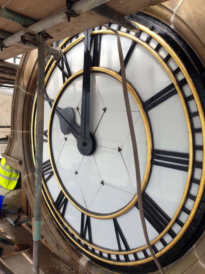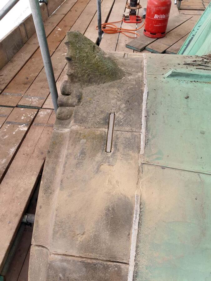 Our Stone masons also replaced the cramps holding the stone around the clock faces. The original iron cramps had started to corrode causing hydraulic jacking. This is where the iron expands and puts pressure on the surrounding stone, often resulting in cracking or corrosion. Stainless steel cramps replaced the old ones, which were then embedded with molten lead. Combination of stainless steel and lead allows the metal to expand and contract without causing damage to the surrounding stone work.