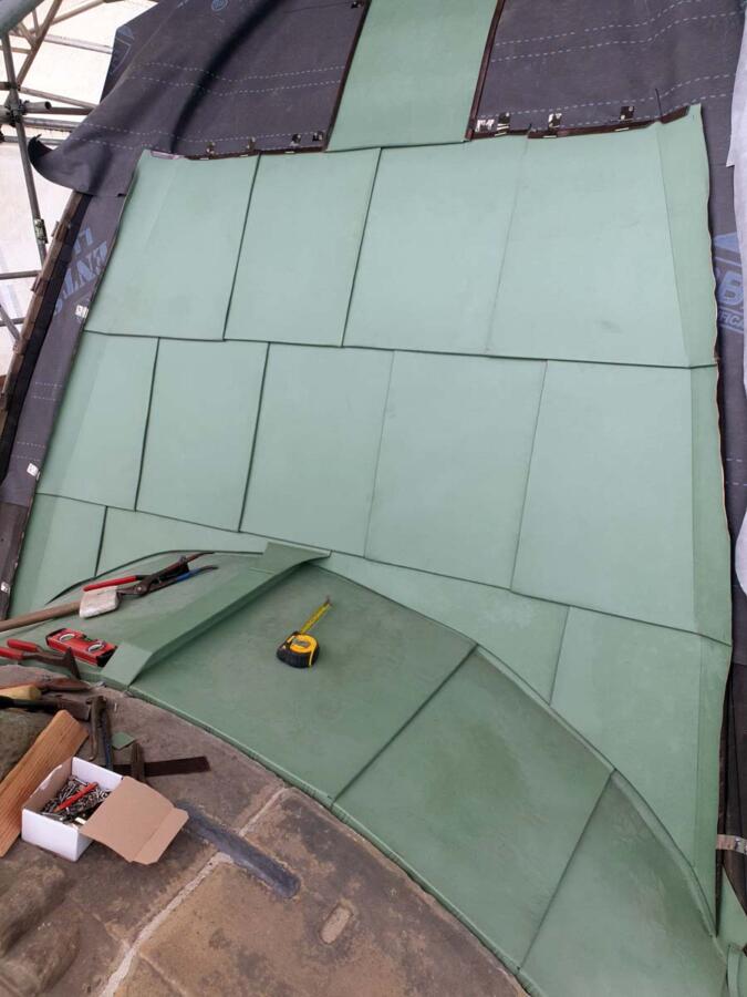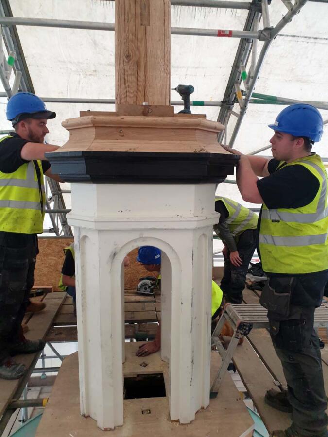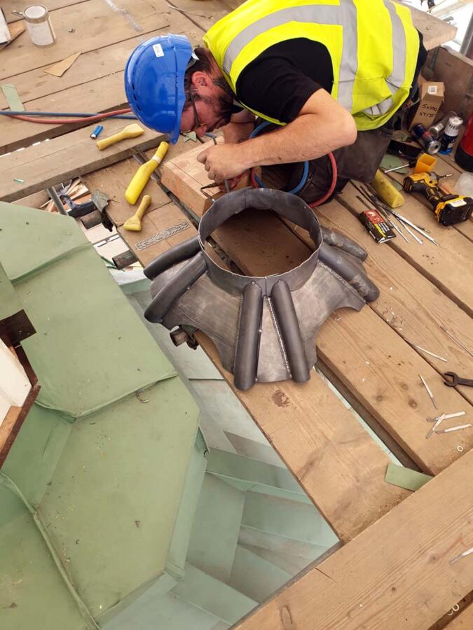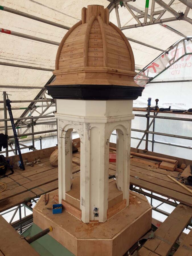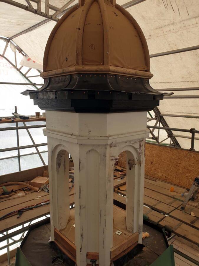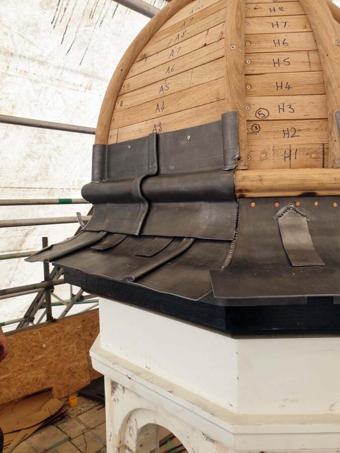 Once the lantern had been fabricated , it was returned to the Town Hall and hoisted into place on top of the newly clad copper dome. The oak timber was prepped and painted using linseed oil based products. These protect the timber from the elements but still allow it to breath, increasing the longevity further. The 2 small domes located at the top of the lantern have been clad in ornate lead details for aesthetics, but also to provide weather proofing and stop any water ingress to the internal structure of the lantern.