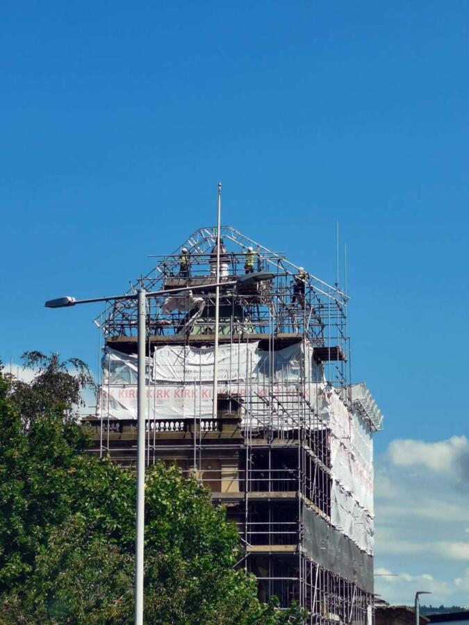 The Clock Tower restoration has taken approximately 16 weeks and has now been signed off as completed. The scaffold structure is set to be dismantled over the coming weeks, revealing the the newly renovated Clock Tower. Scaffolding has already been erected on each side of the clock tower to facilitate phase 2 re roofing and stone repairs.
