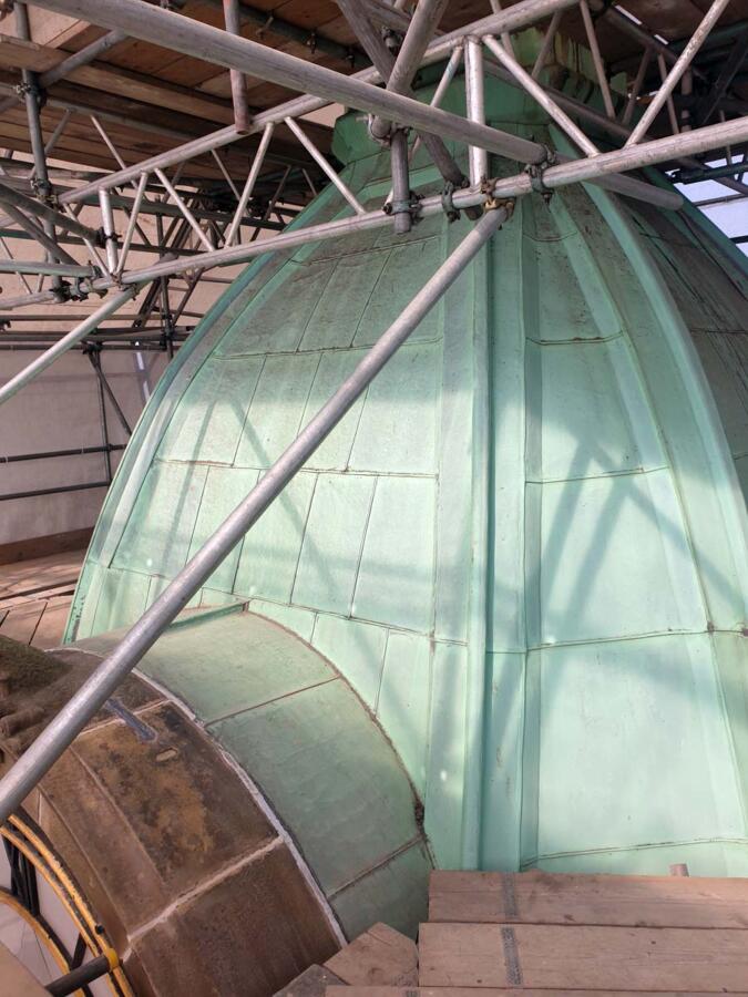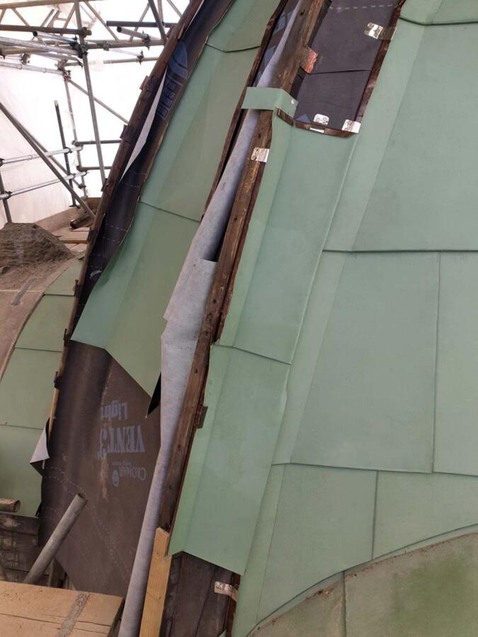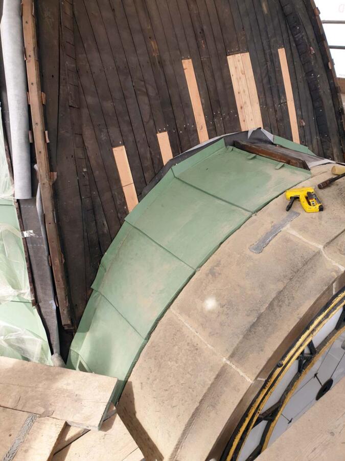 The clock tower dome was originally clad in lead when it was constructed in 1888, but was replaced with copper in the late 50’s. A thorough survey of the copper revealed micro cracking, failed joints, pitting and accelerated corrosion in certain areas and the decision was made to completely replace the copper cladding. The old copper was removed and some minor timber repairs were made to the substructure, before the new copper was installed. We used a pre-patinated copper to match the colour of the old cladding. New internal gutters were also fitted to remove water from the base of the copper dome.