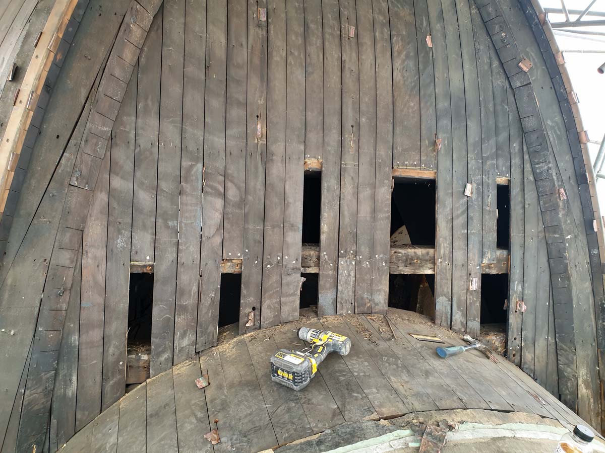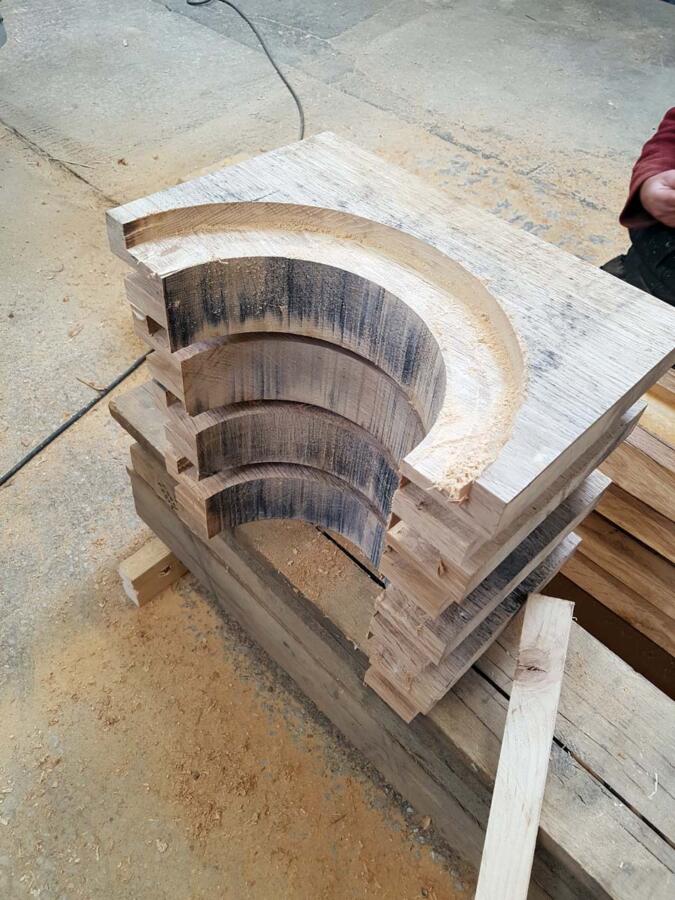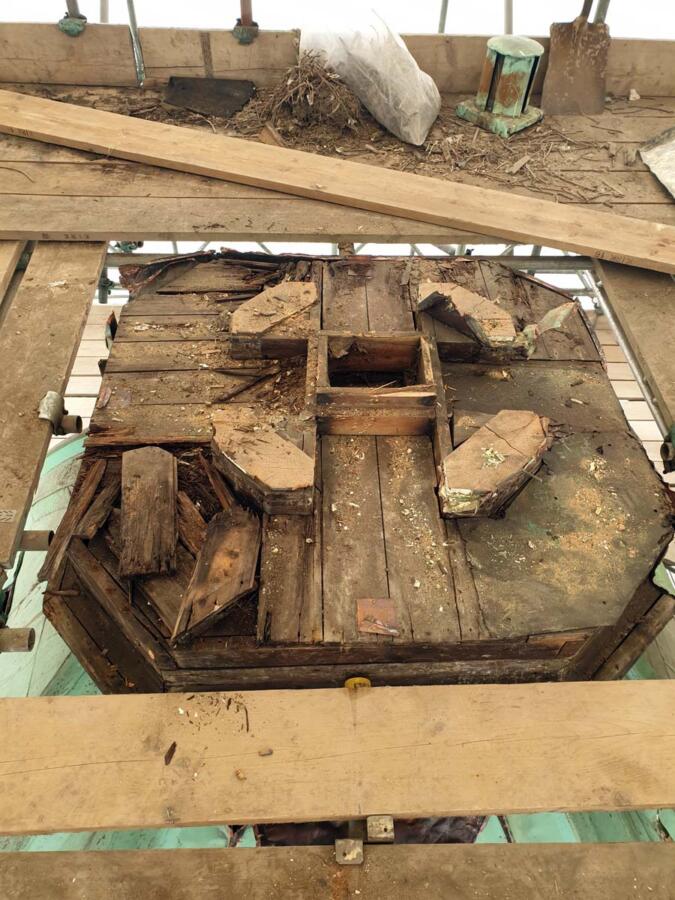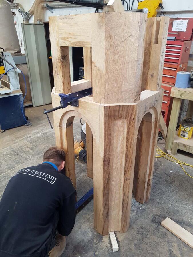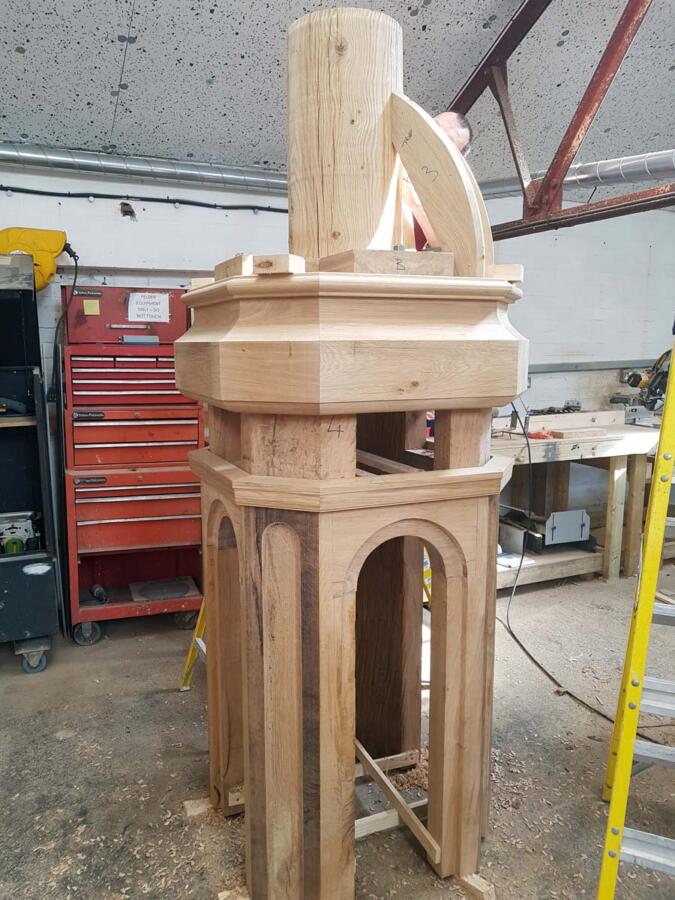 At the highest point of the clock tower above the copper dome was an ornate lantern. The lantern was the original structure, fabricated from various timbers including oak. The main legs of the structure were in relatively good condition considering their age, however all other elements of the lantern were rotten. The Lantern was removed from the clock tower and returned to our joinery workshop, where it was replicated in a combination of new air dried oak & kiln dried oak. Our joinery team made some adjustments to the design and construction of the new lantern to ensure longevity of the structure.