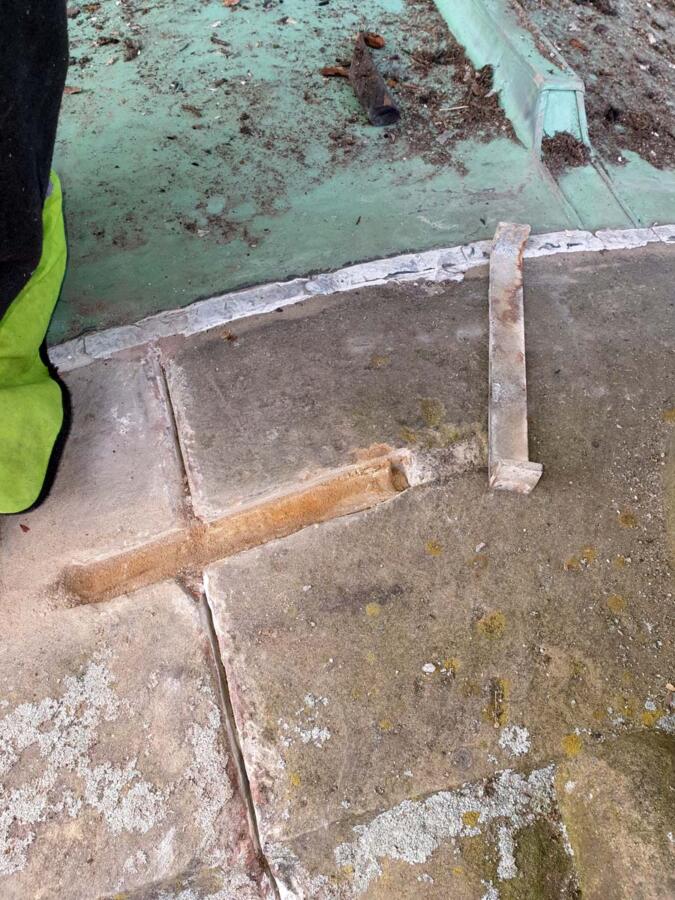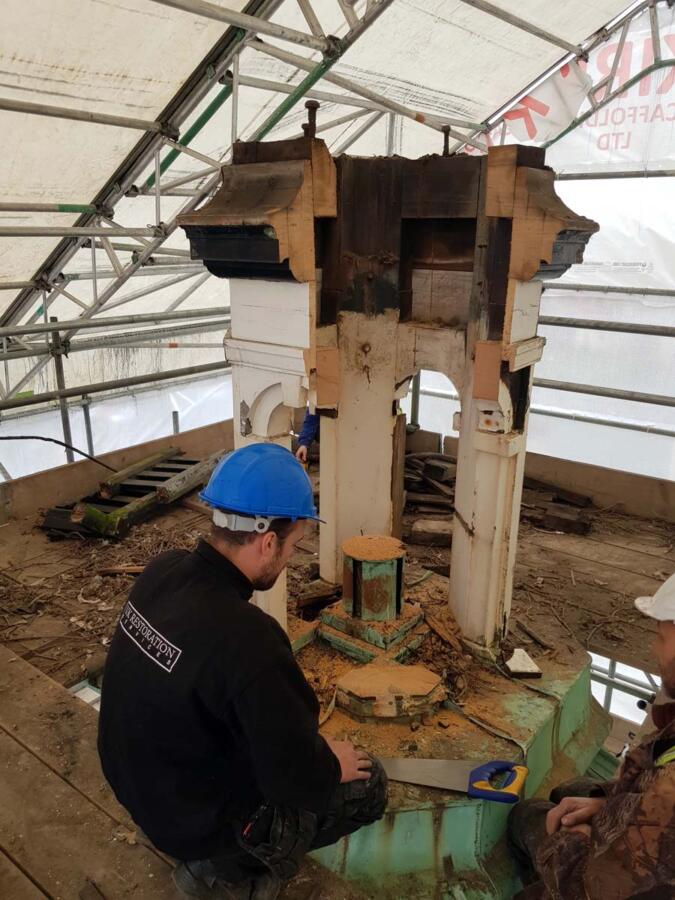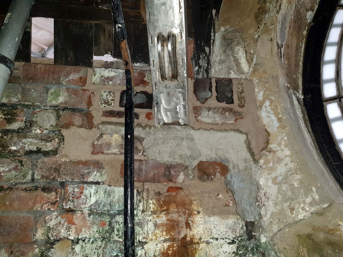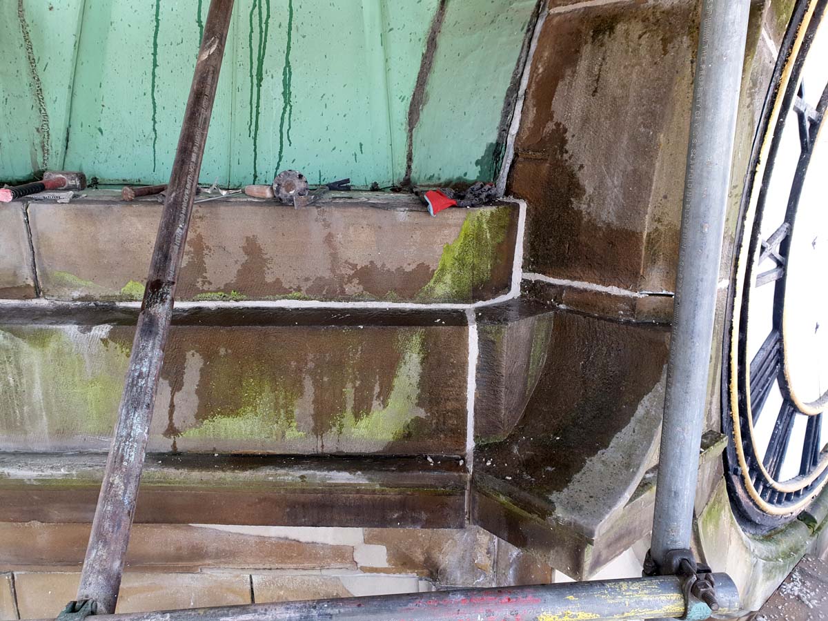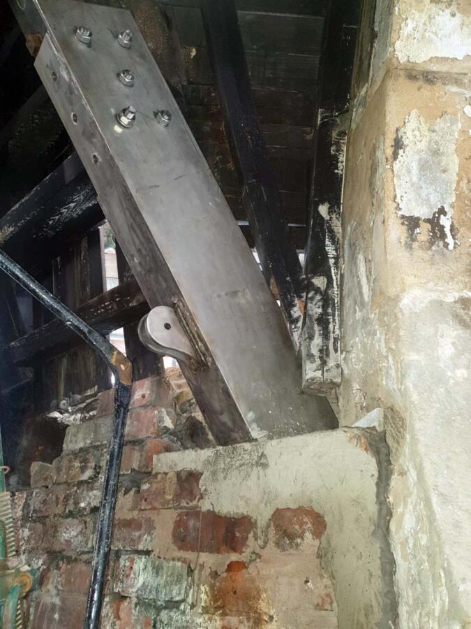 Due to the water ingress issues on the clock tower, our team had to make some major repairs to the internal structure of the clock tower dome. The bases of the main support beams & steel brackets holding them had become rotten and posed a serious malfunction if not replaced. The internal stone work was also saturated and stone erosion had occurred. Our team started by repairing the stone work to create a solid base for the support beams to be remounted. The rotten sections of timber were cut out and new stainless steel brackets fabricated and install.