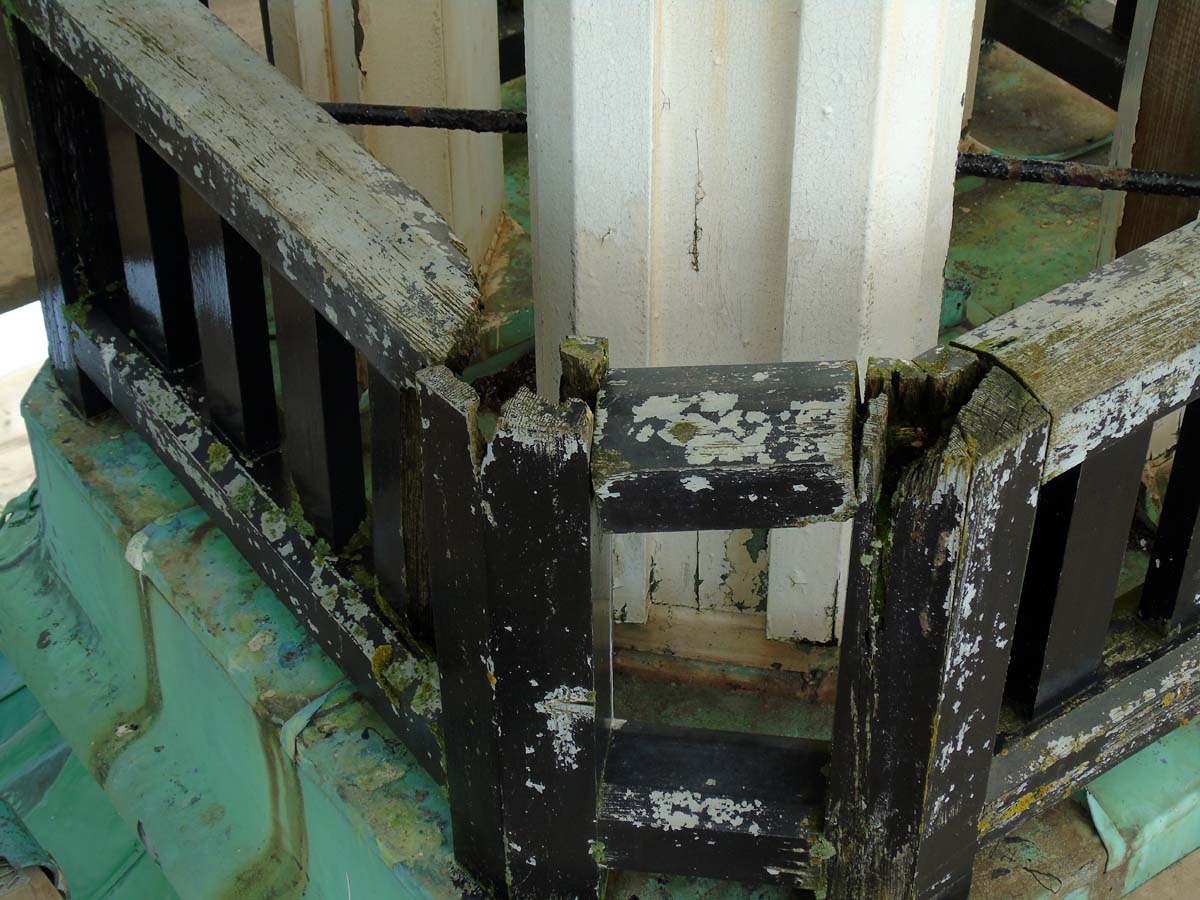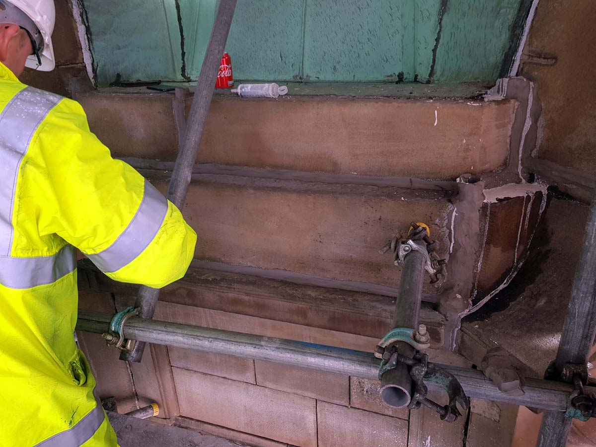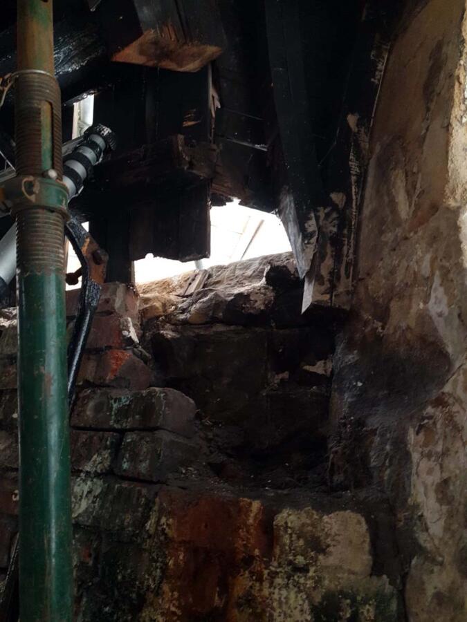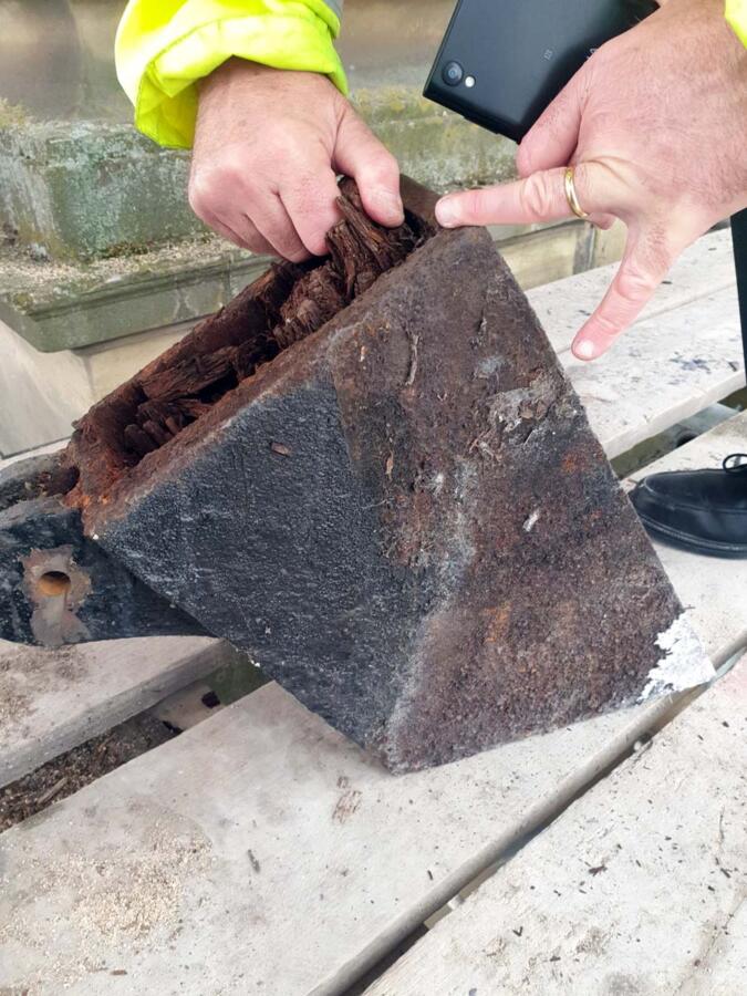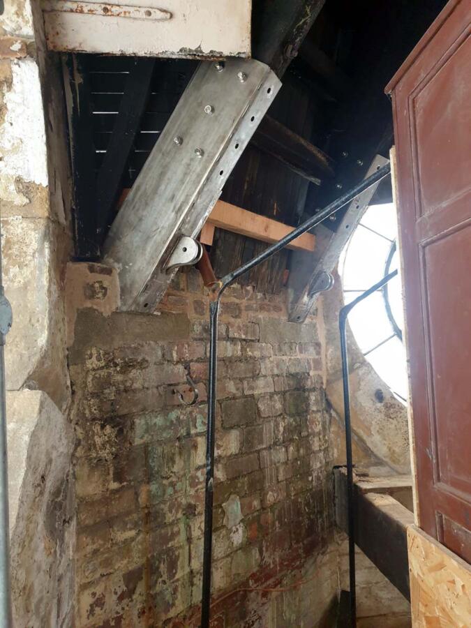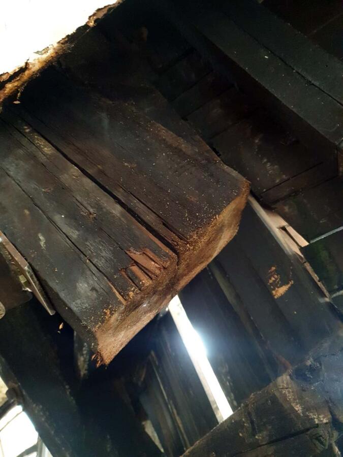 Due to the water ingress issues on the clock tower, our team had to make some major repairs to the internal structure of the clock tower dome. The bases of the main support beams & steel brackets holding them had become rotten and posed a serious malfunction if not replaced. The internal stone work was also saturated and stone erosion had occurred. Our team started by repairing the stone work to create a solid base for the support beams to be remounted. The rotten sections of timber were cut out and new stainless steel brackets fabricated and install.