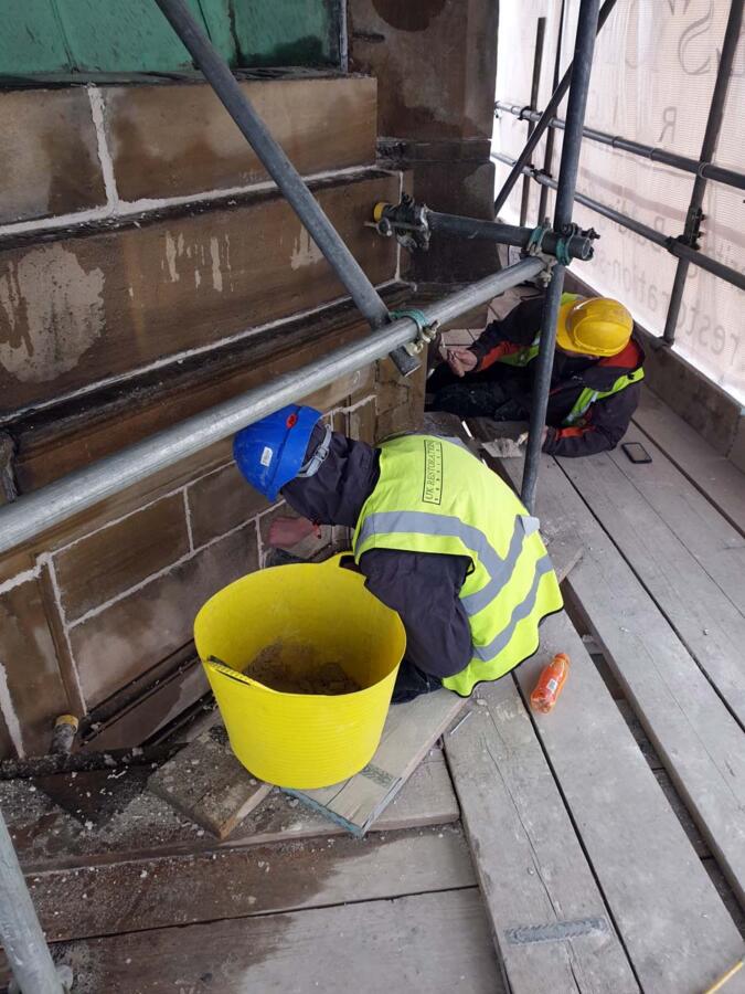 The clock tower had previously been pointed with a cement based mortar which had failed, causing stone deterioration and water ingress through the stonework. Our team of stone masons removed any remaining cement based mortar and flushed all the joints with clean water. The stone work was then grouted using a free flowing lime Mortar. Clay is used to close the joints of the stonework, allowing the mortar to flow into the gaps. Once the clock tower was fully grouted, our team then applied a lime based pointing to the exterior. Lime based mortars are porous and allow moisture to escape easily though the joints as apposed to through the stone.