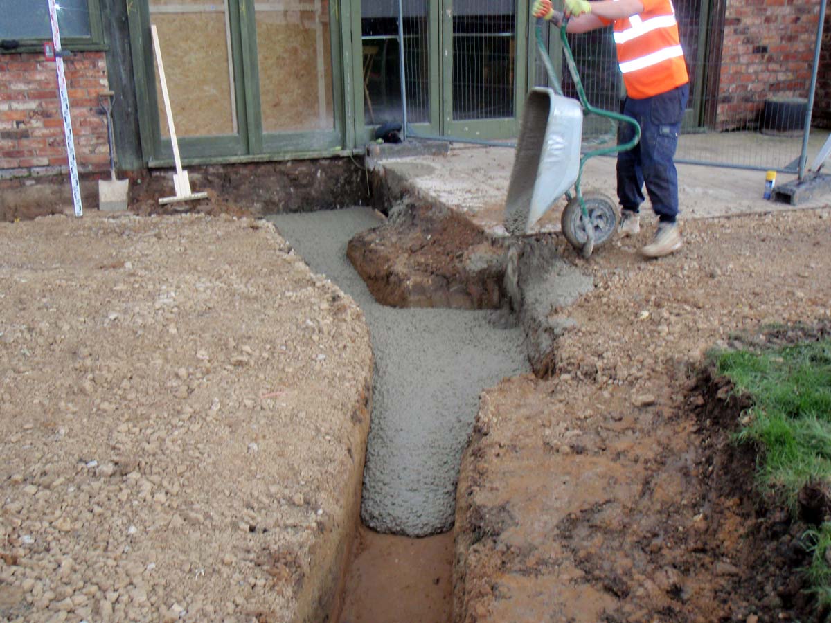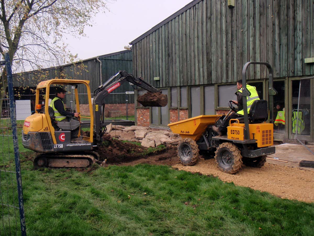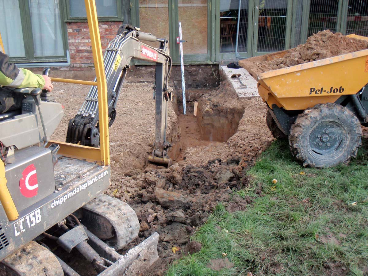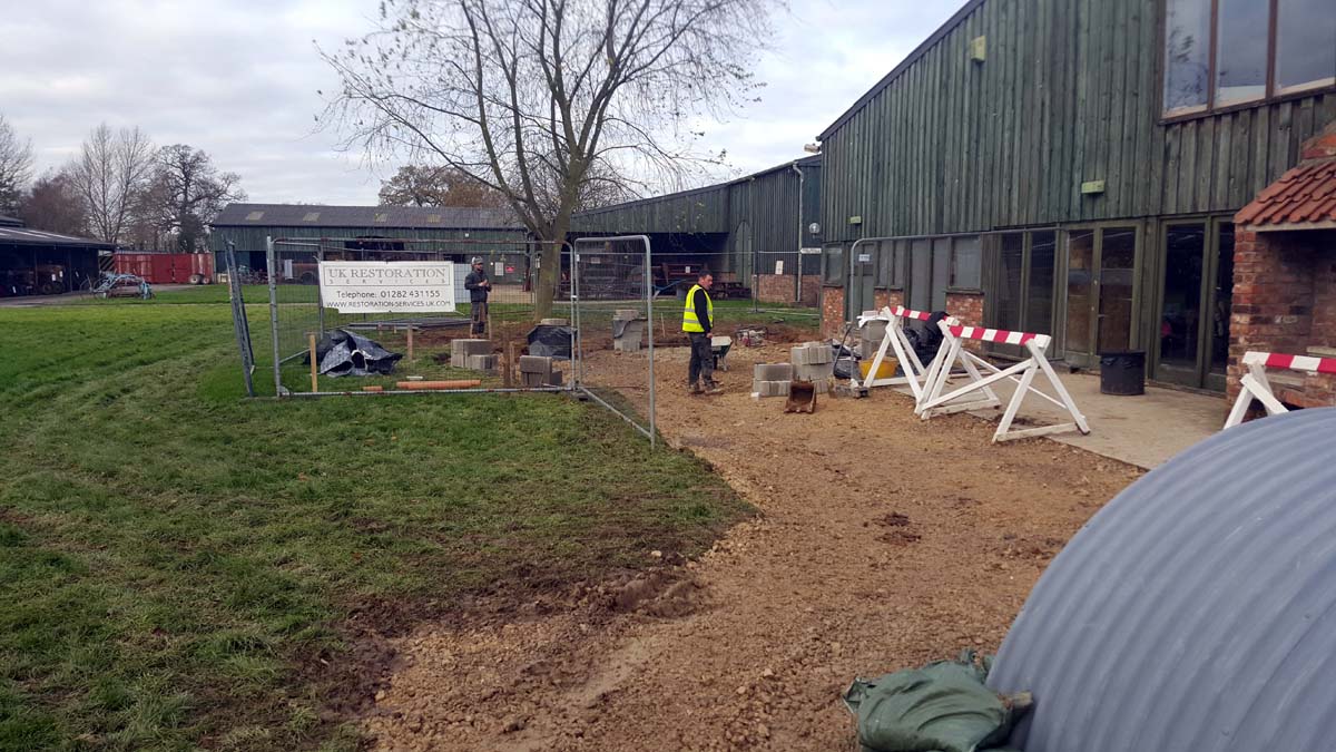 At the museum where the Gin Race was to be reconstructed, excavation, concrete and drainage works were carried out. We located the existing drainage run. Flexible collars were cut onto the drain where it was to pass through the new foundations of the re-erected building. The pipe was exposed and encased with concrete. The existing manhole was capped, and the frame and cover set aside for reuse. A new inspection chamber was formed, a new land drain was constructed around the perimeter of the new building and connected to existing drainage. Foundations were excavated to allow for the construction of the floor which was to be the same level as that of the existing Museum building.