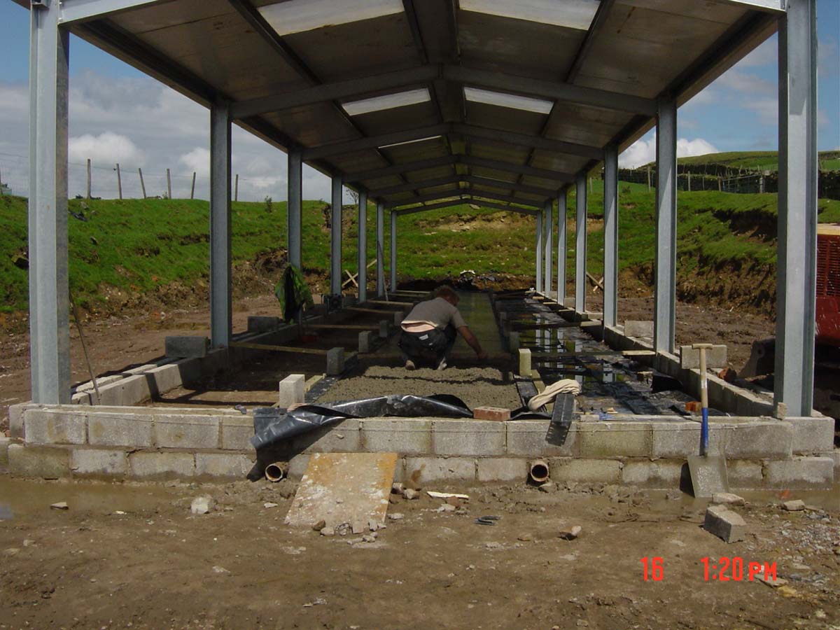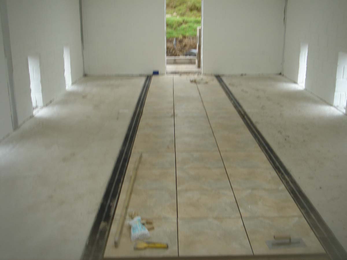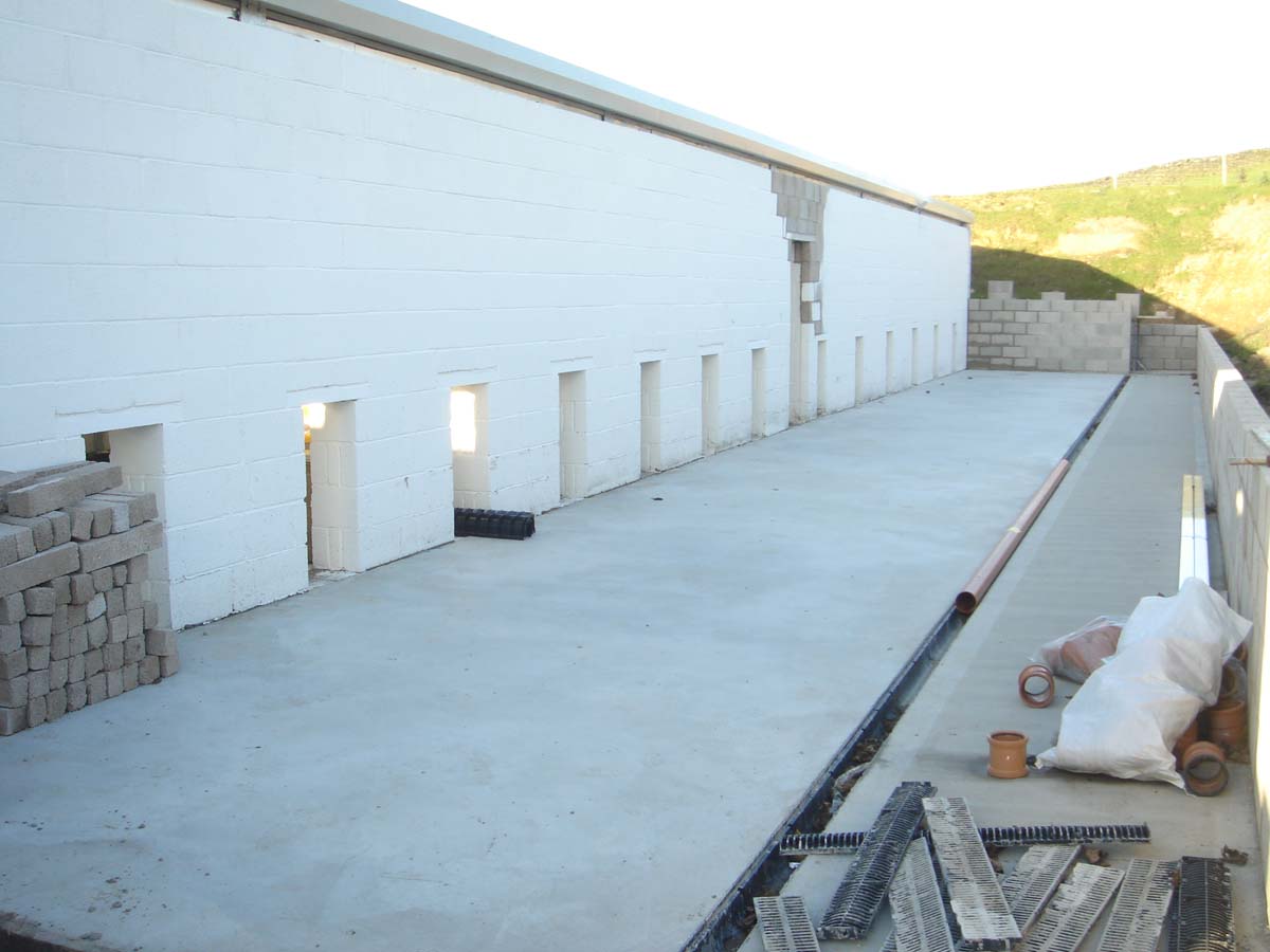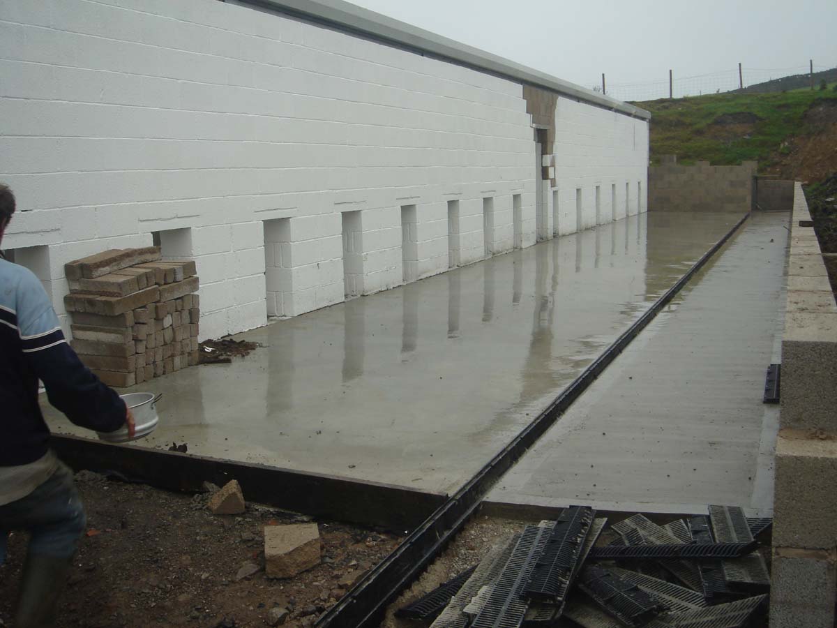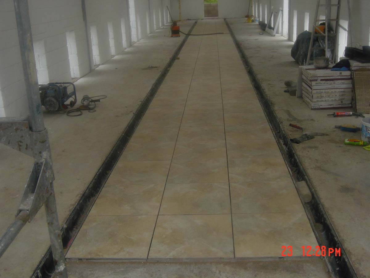 The centre channel was cast level. The two side floors had a 30mm fall to the centre drainage channels. The concrete had to be left 20mm low of the channels to allow for the floor tiles.