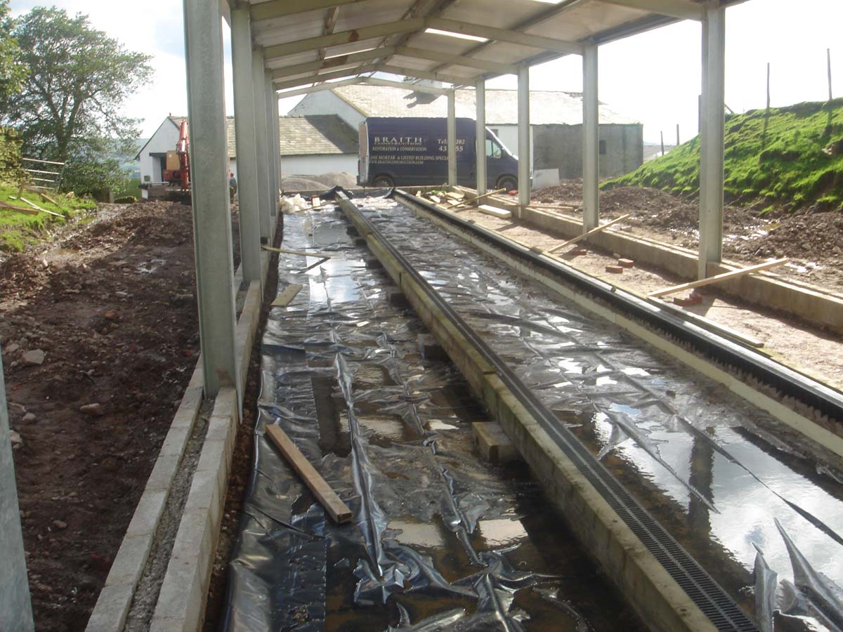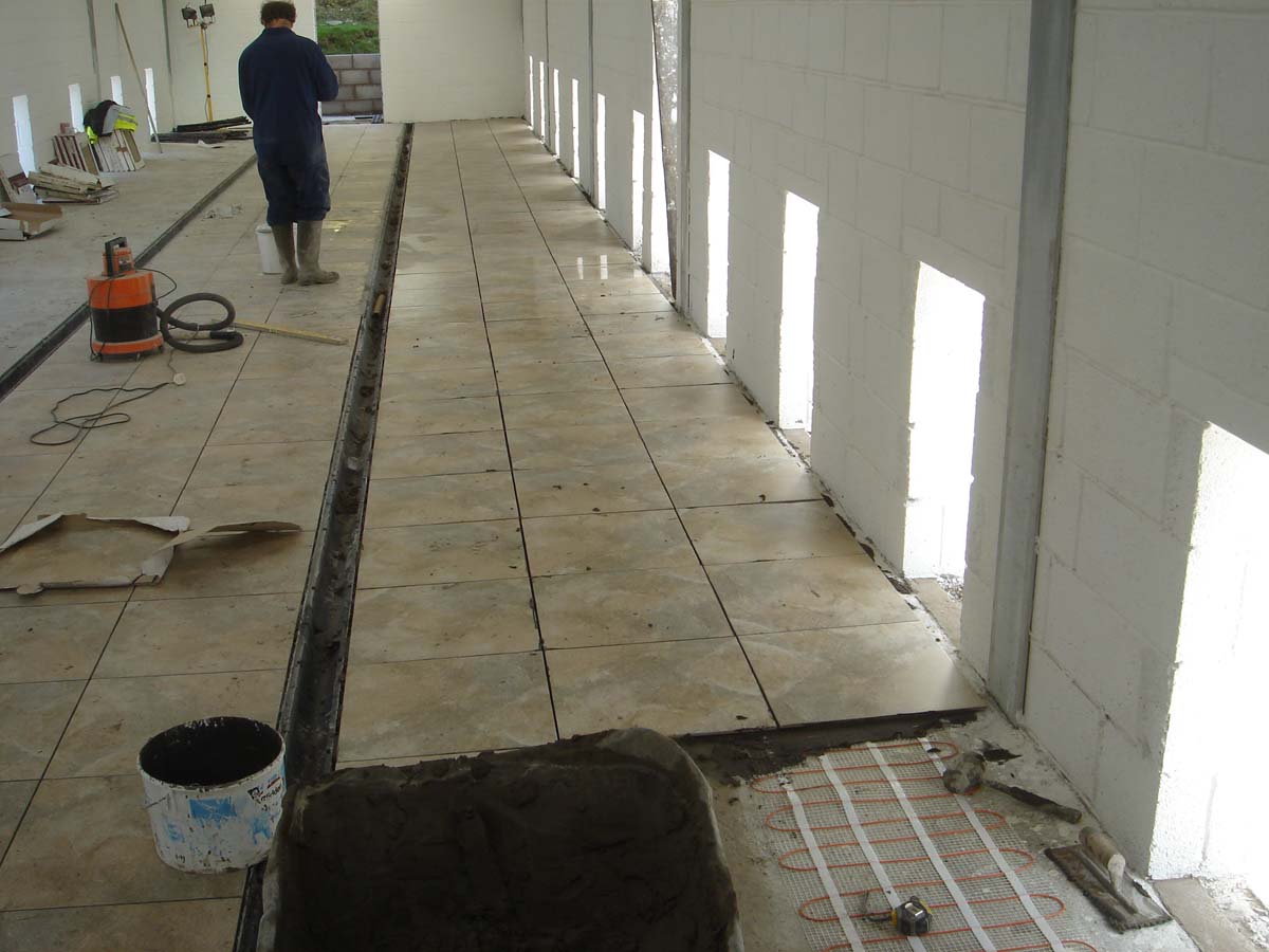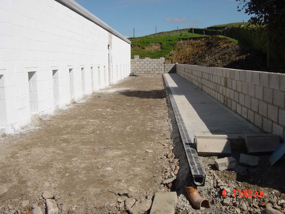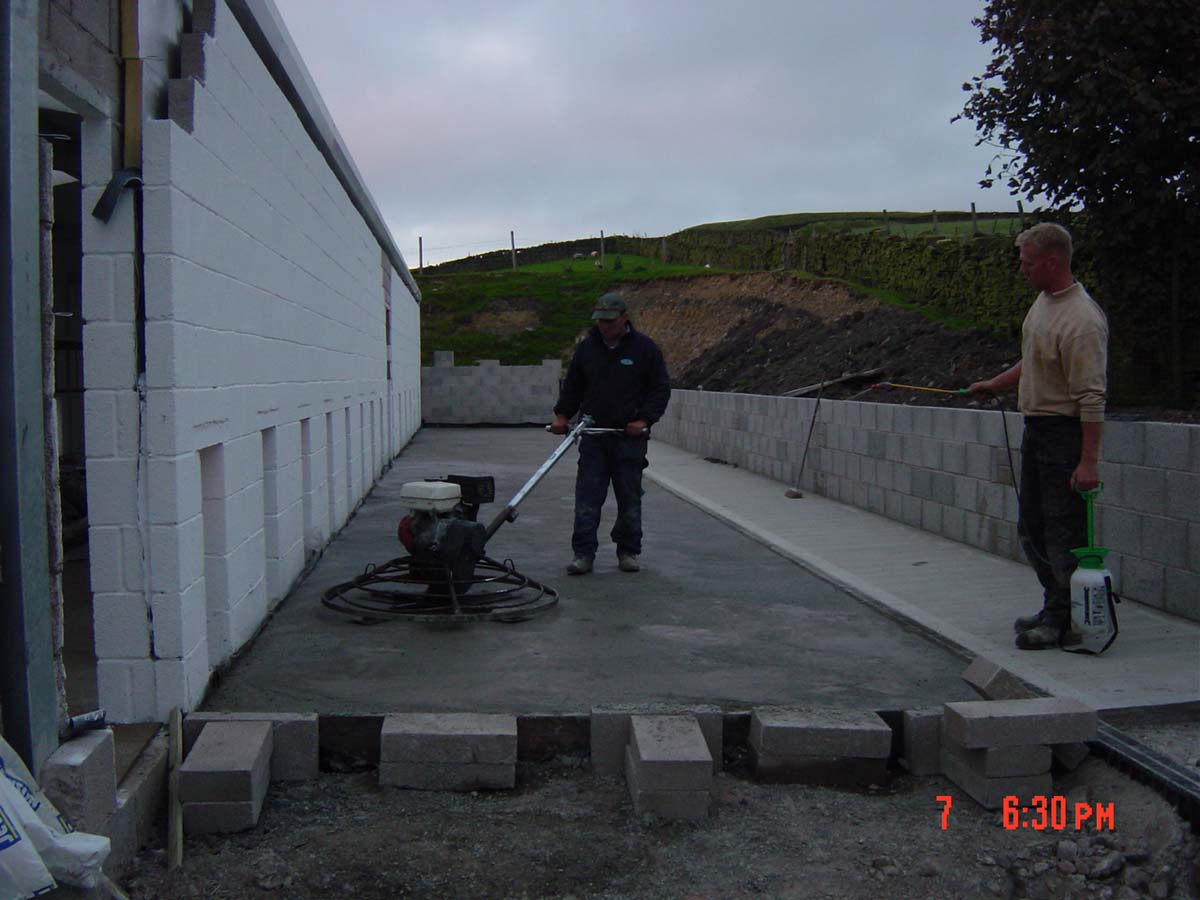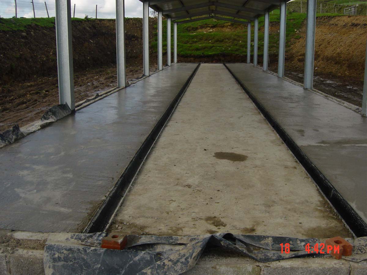 The centre channel was cast level. The two side floors had a 30mm fall to the centre drainage channels. The concrete had to be left 20mm low of the channels to allow for the floor tiles.