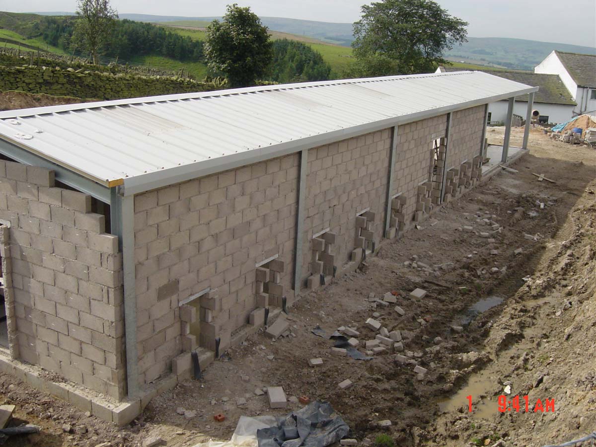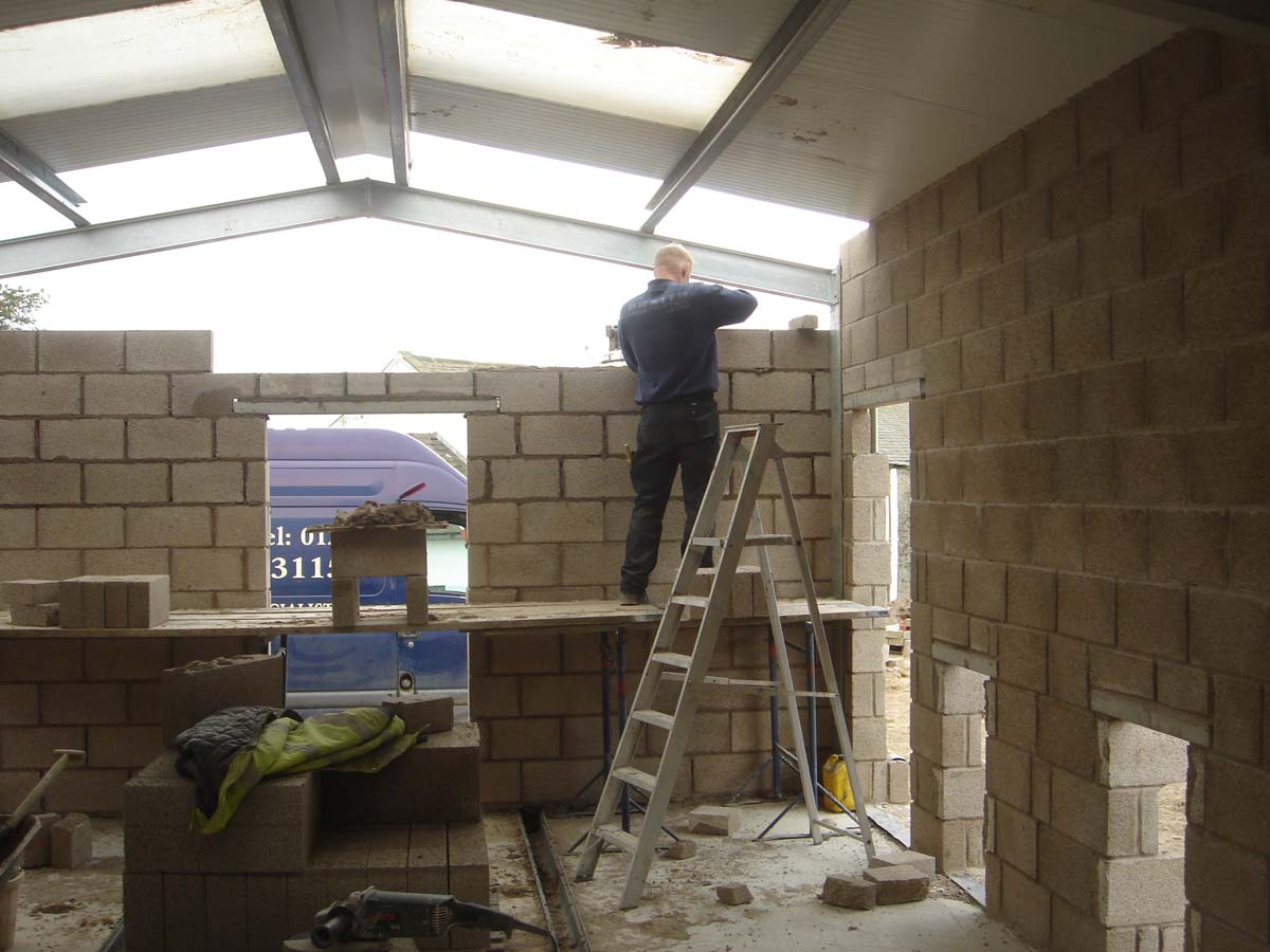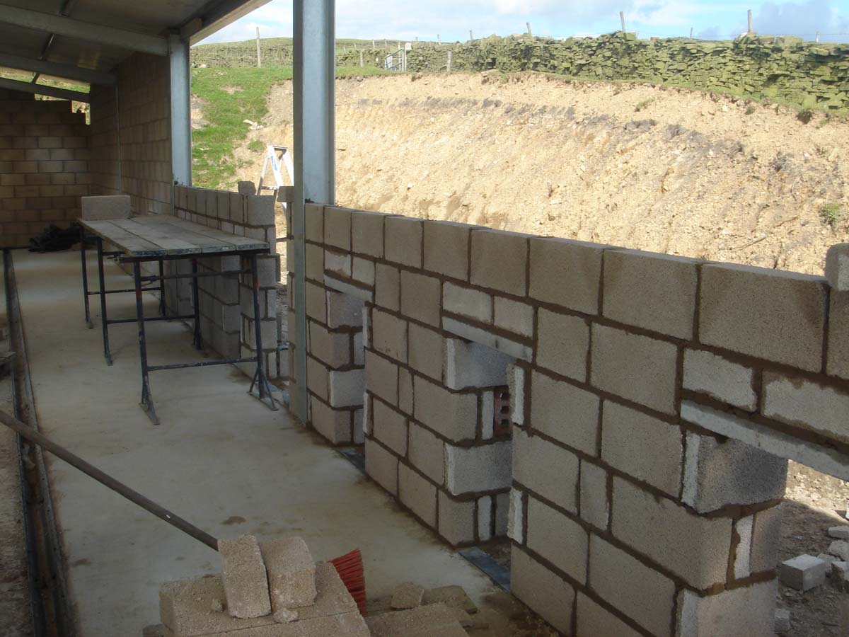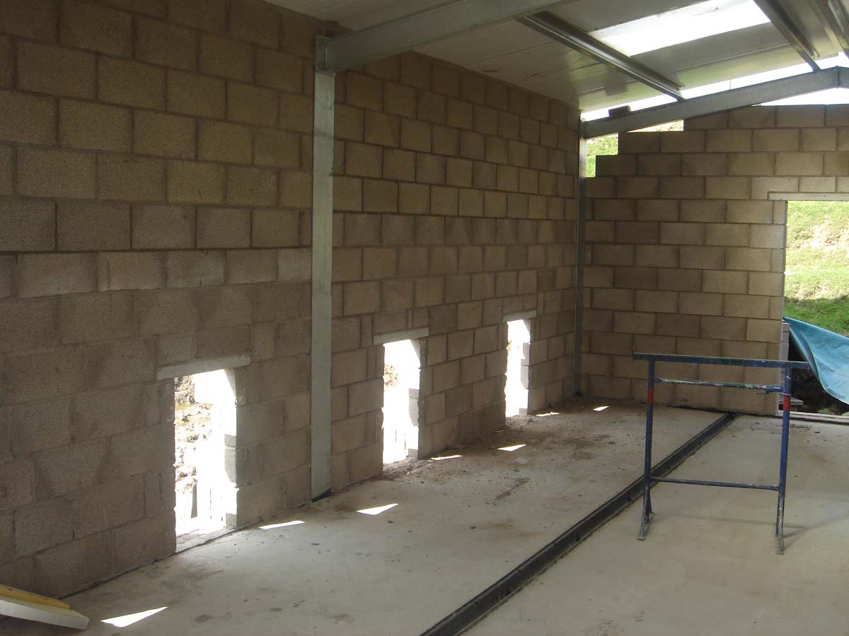 Our builders used 4″ concrete blocks to build out of the footings to floor level. The cavity at this level was filled with concrete. We used steel Z perlins for the roof area, these will later take the composite roofing sheets. Our building contractors used a standard sand cement mortar for laying the block-work.
