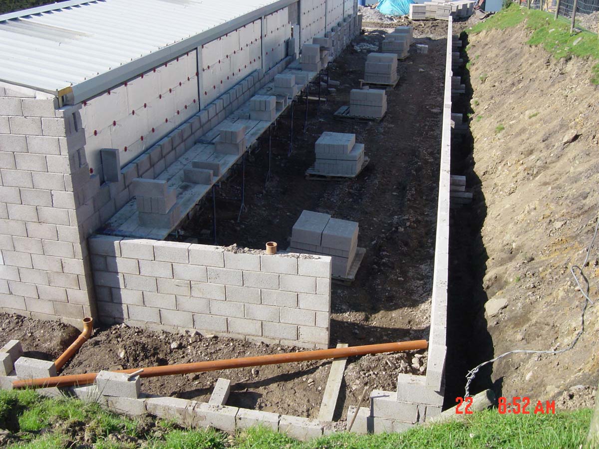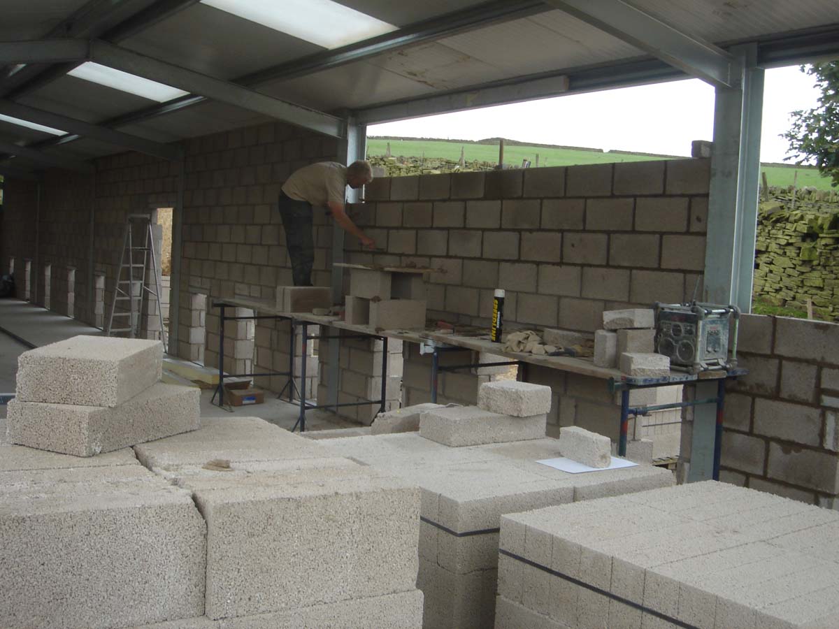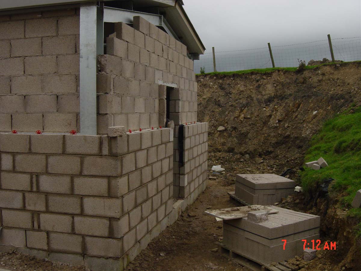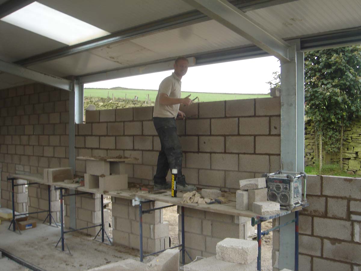 Our builders used 4″ concrete blocks to build out of the footings to floor level. The cavity at this level was filled with concrete. We used steel Z perlins for the roof area, these will later take the composite roofing sheets. Our building contractors used a standard sand cement mortar for laying the block-work.