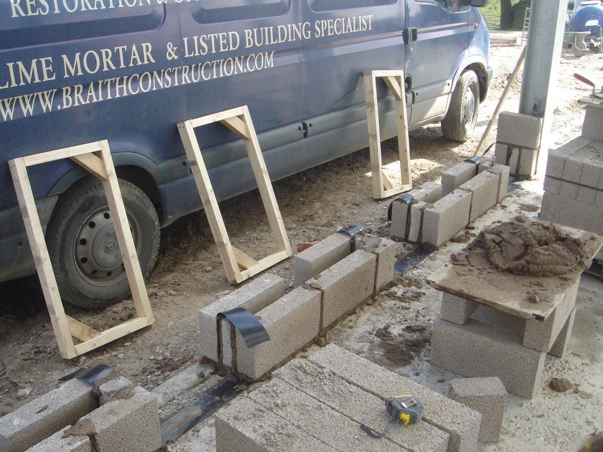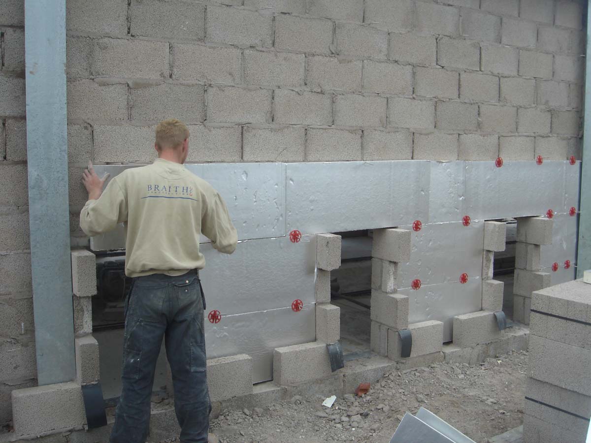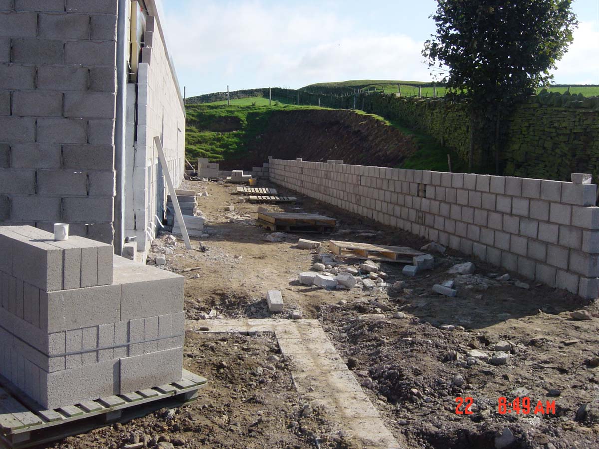Our builders spent 3 weeks laying the 4″ concrete block. The builders built up the internal walls first, before starting on the external walls. The construction of the wall is two 4″ concrete block with a 50mm cavity & 50mm cavity slab insulation. The block-work had to be neat & tidy as all the block-work will be on show. So all the joints of the block-work had to be filled & jointed.
