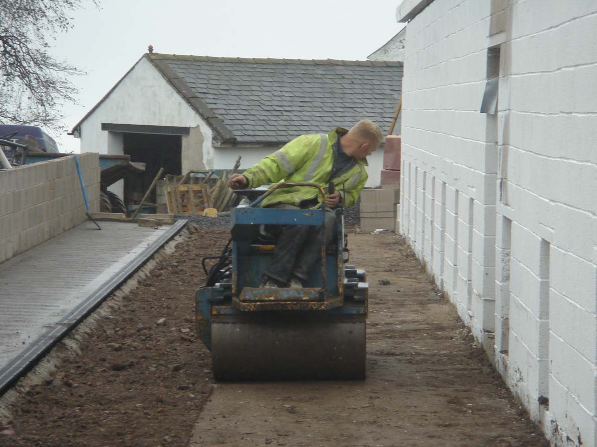 Once all the perimeter block-work has been laid by our builders, we filled the centre will a strong concrete mix. This will stop the block-work collapsing. We then graded the floor area and installed a crushed hardcore sub base. This was laid and compacted in layers.
