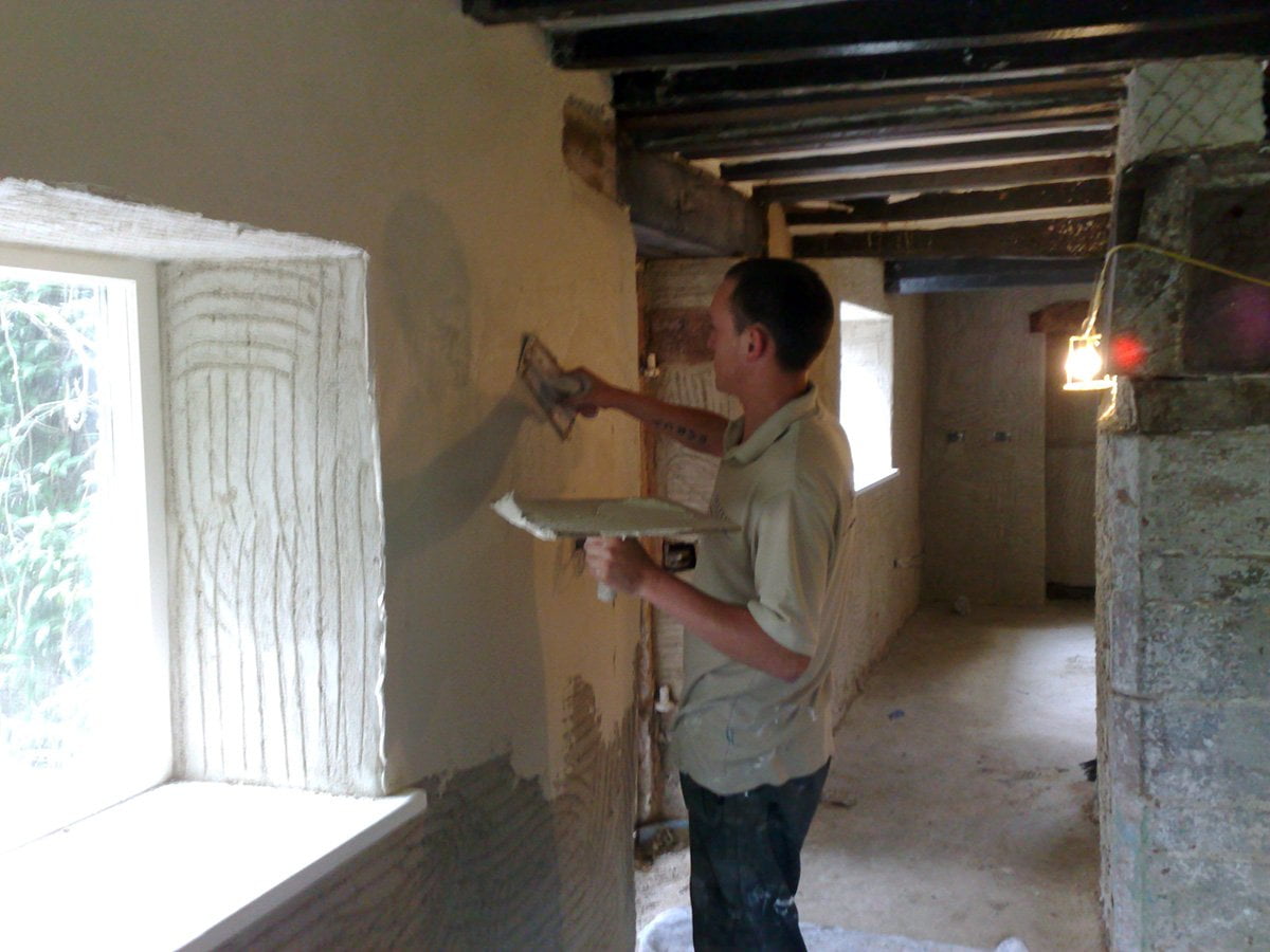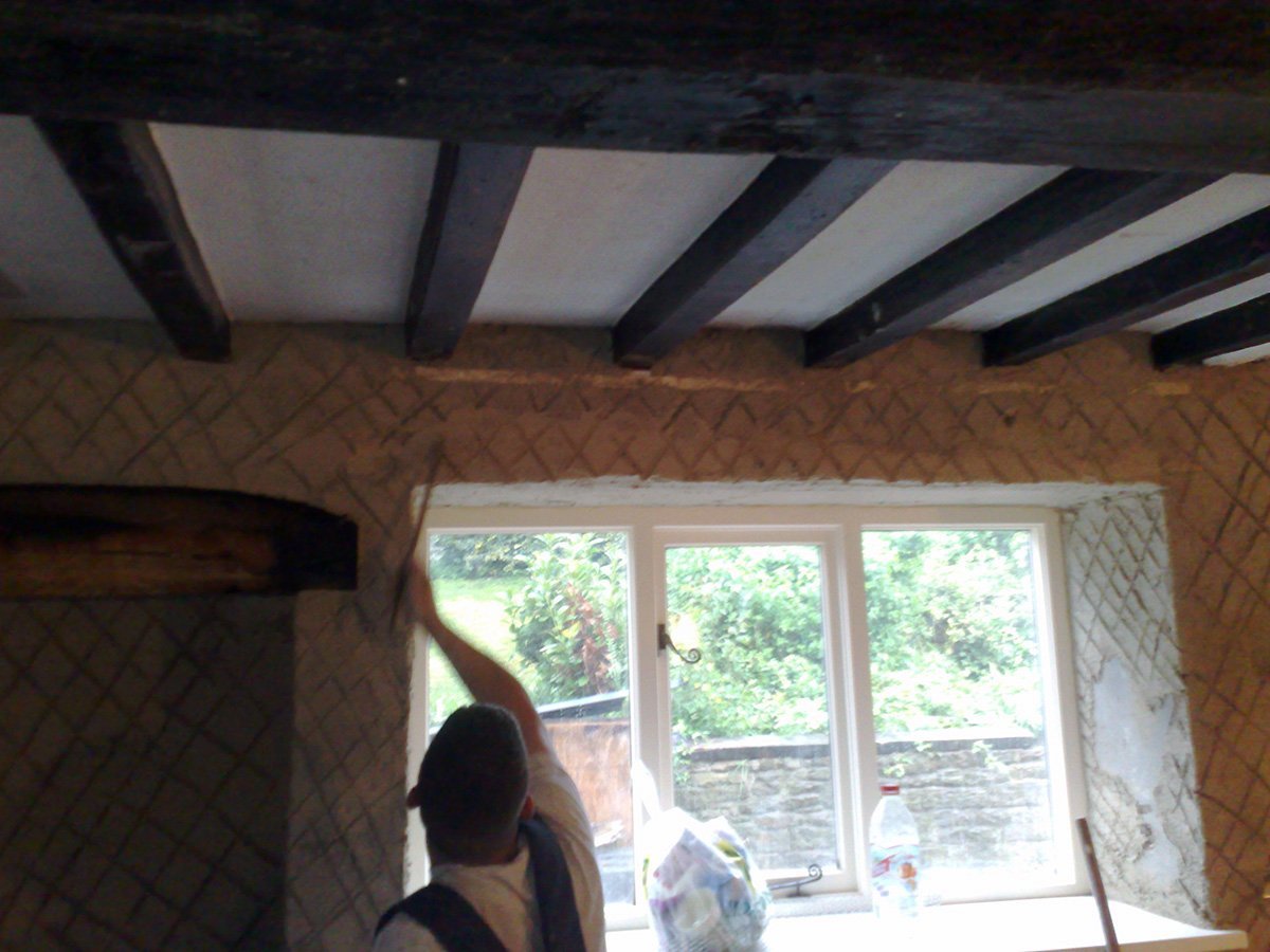We used a Lime Putty based Plaster to plaster most of the main house. We applied 3 coats of Lime Plaster to this project as the walls were fairly level. The Oak Beams and joists on the ceiling still had the old lime plaster applied which was in good condition. Most of the Original Lime Plaster was also applied in a 3 coat system.