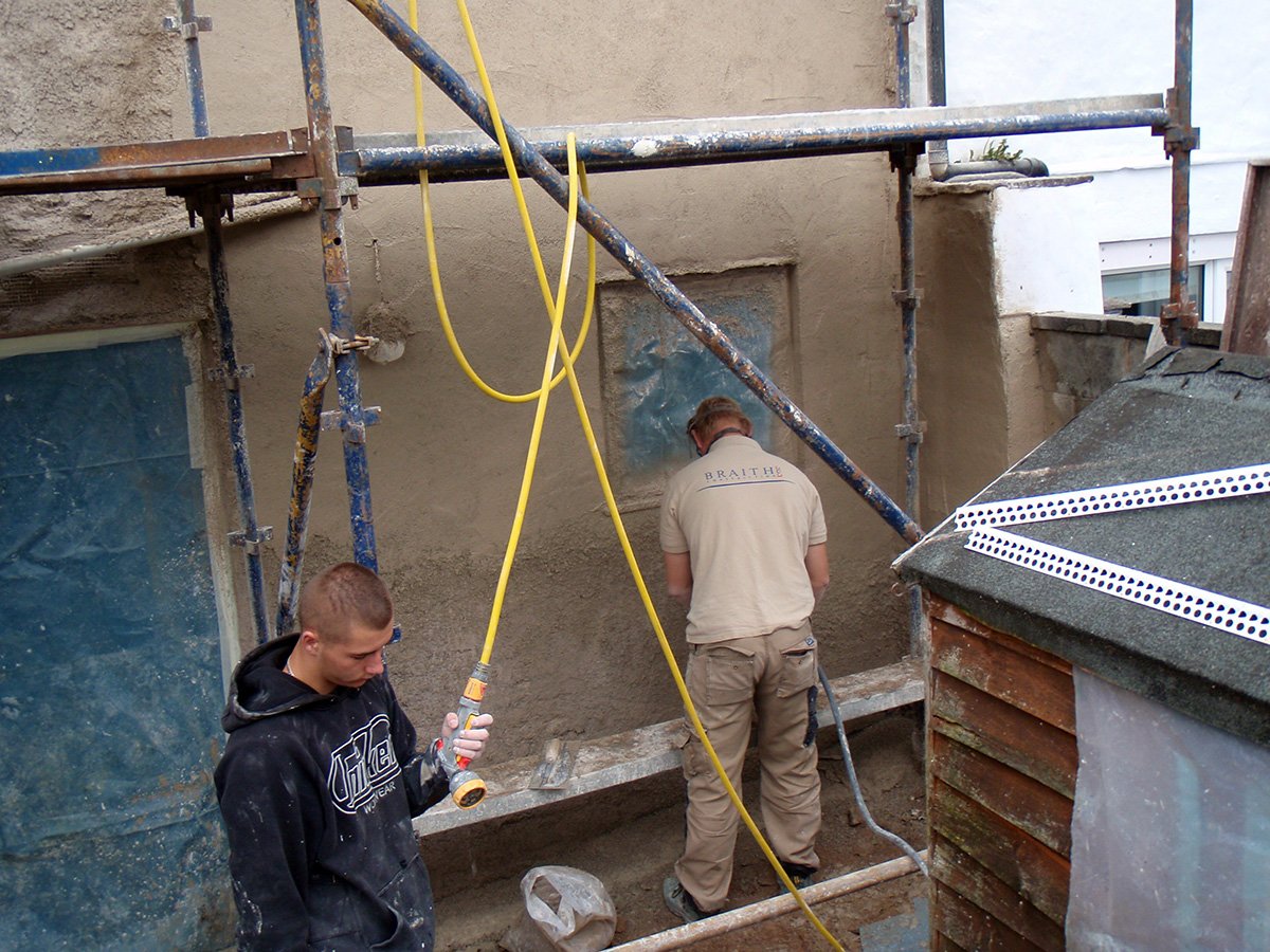 We removed the existing Lime Render from the rear wall using small air powered tools. There was some additional work filling voids & re-bedded stones.