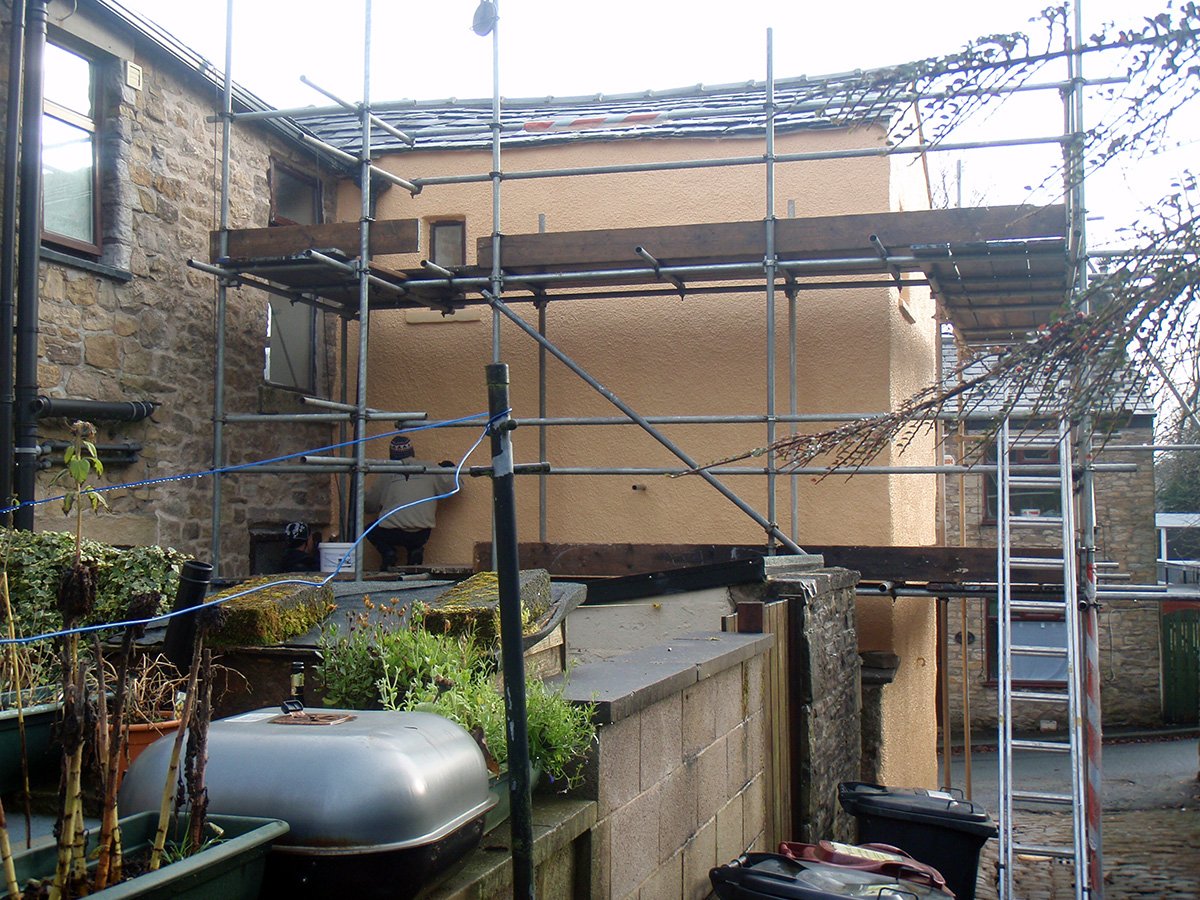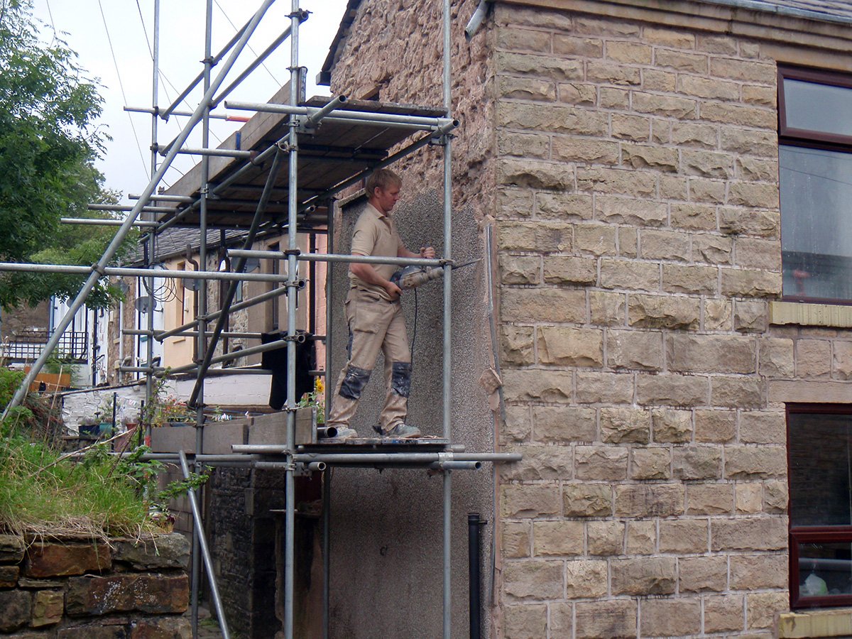 This project in Darwen Nr Blackburn Lancashire involved Lime Rendering the rear elevation of this end terrace property. Our Team of Restoration Builders took 4 weeks to complete this project. The property had a cement based render on with a pebble dash finish. This was removed using small air tools. Due to the limited working space we took materials to the site daily.