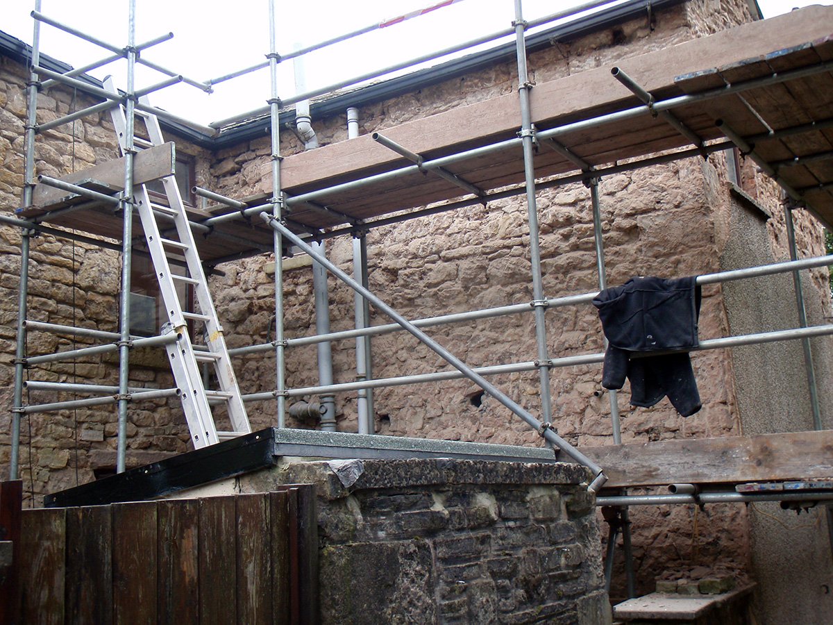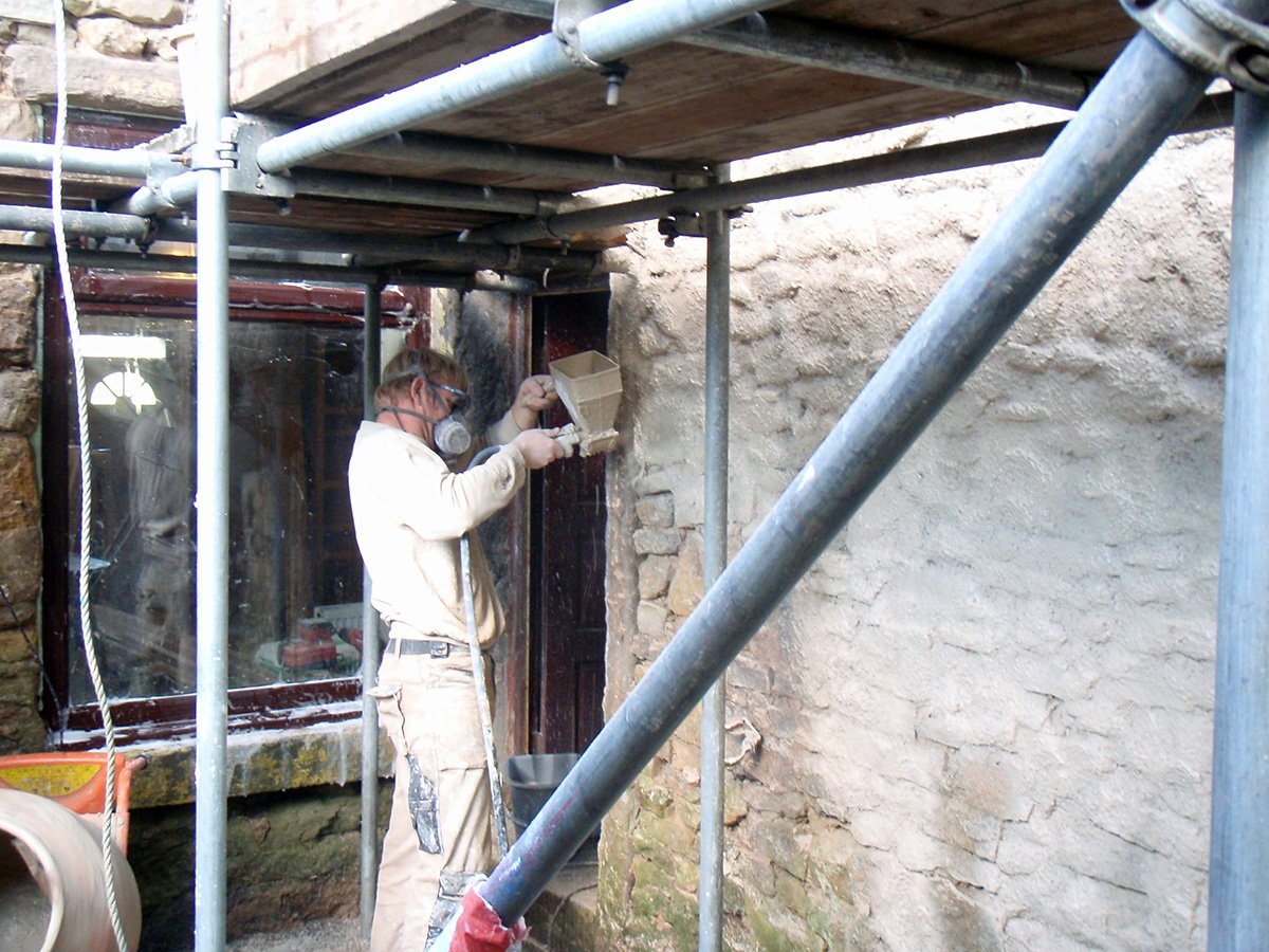 Our Building team started the project by erecting an access to the external elevations. The existing cement based render & pointing was removed from the walls. Removing the existing cement render & mortar from the stone walls was done using small air tools, these avoid damaging the base stone masonry.