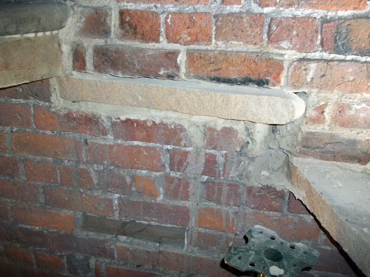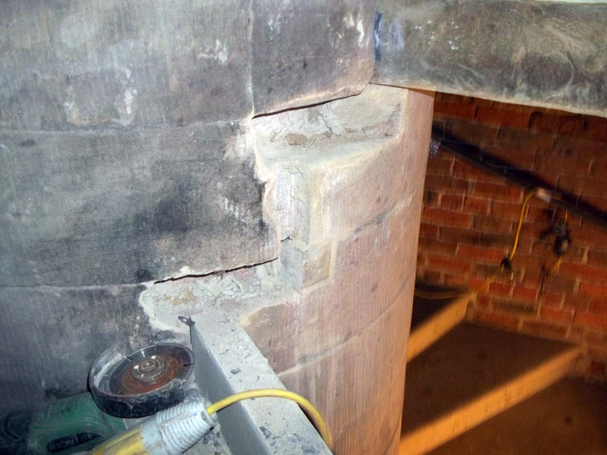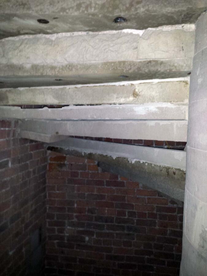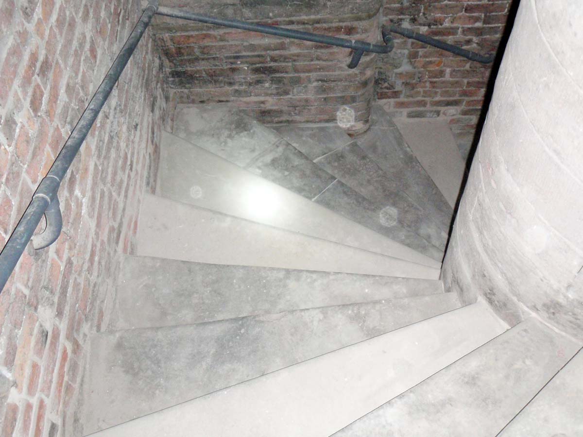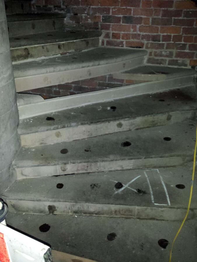 Temporary structural support of the existing spiral staircase was put in place. Existing damaged stone treads and risers were carefully removed. Stone treads and risers removed to be re-used were carefully stored.