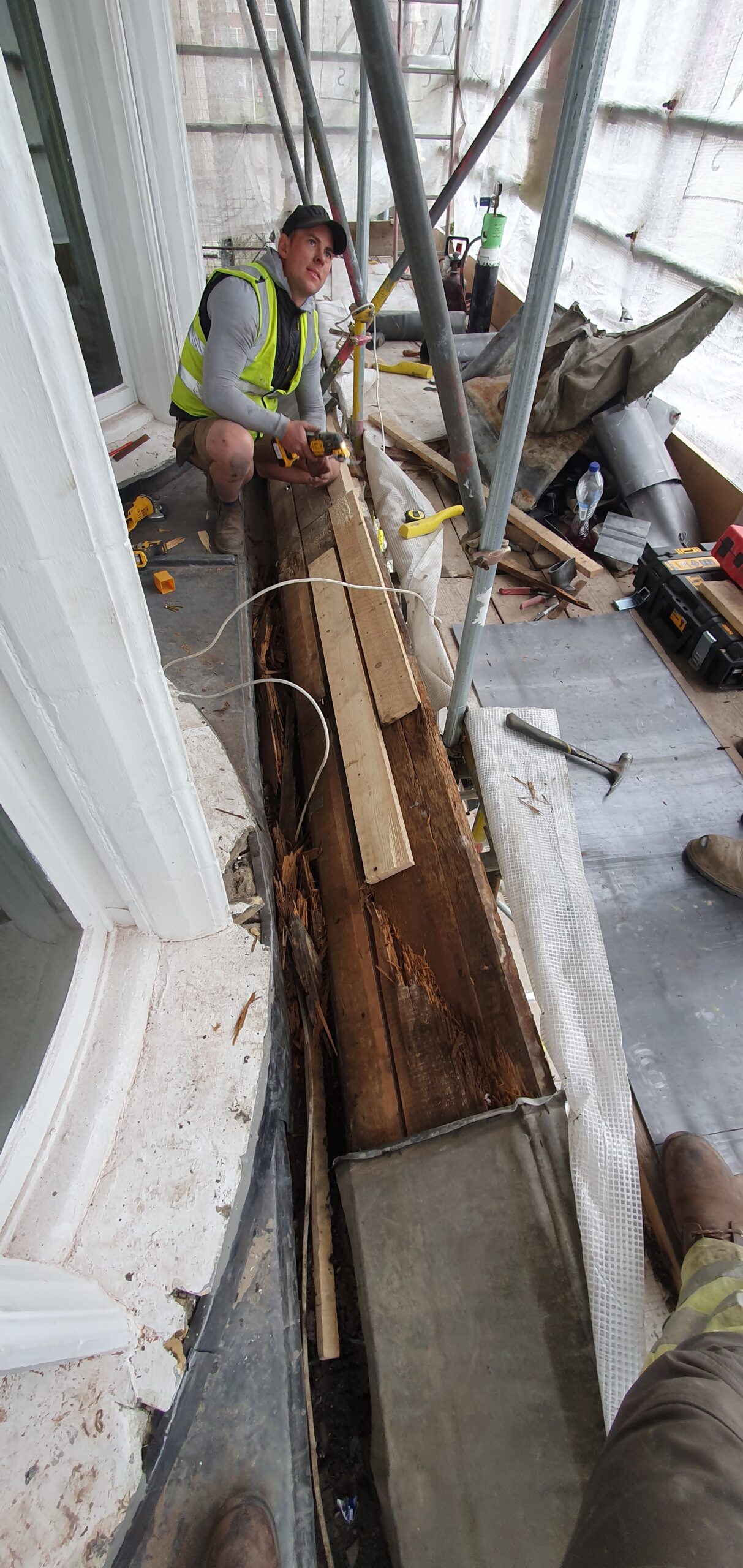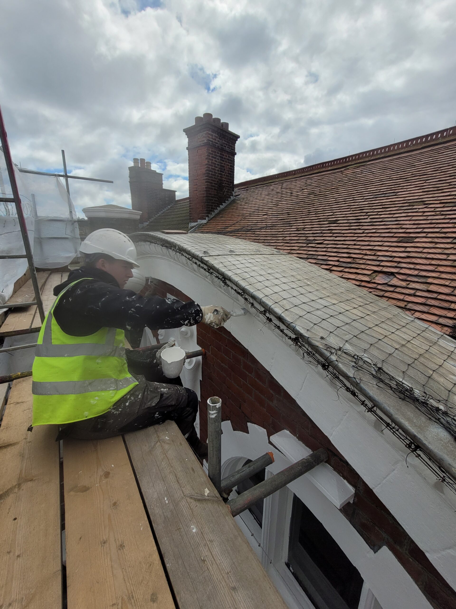 We repointed some empty stone joints to window surrounds use lime based mortar, and also raked out and repointed the corbels where mortar erosion had taken place. Above the bay window, we repaired terracotta masonry to the front elevation and had everything done in the six-week window. Finally, we washed down the stonework, removed loose material and repainted the front in white. Replacing the netting and deconstructing the scaffold, we headed back north with the HSBC building proudly standing tall on Church Street.