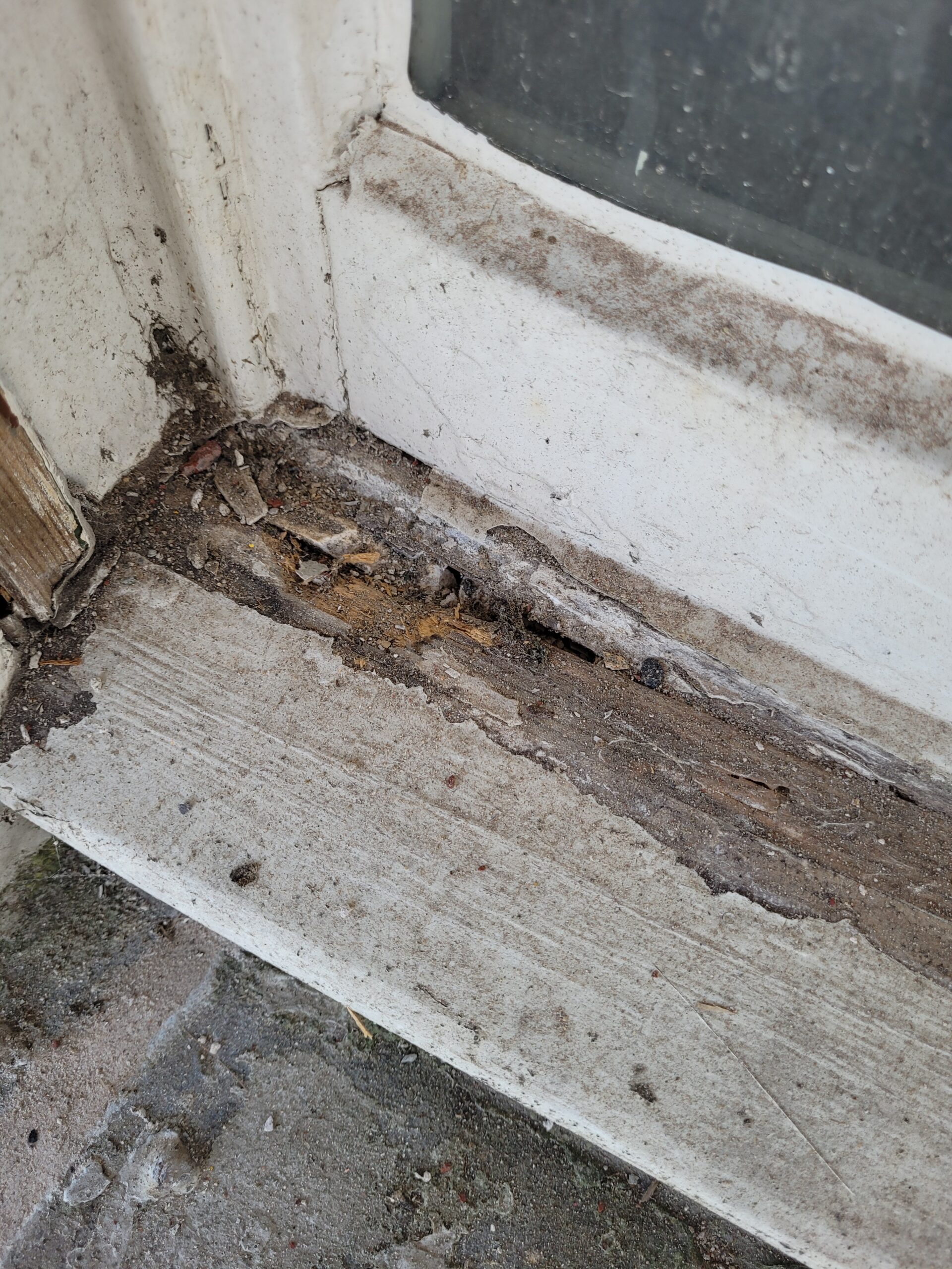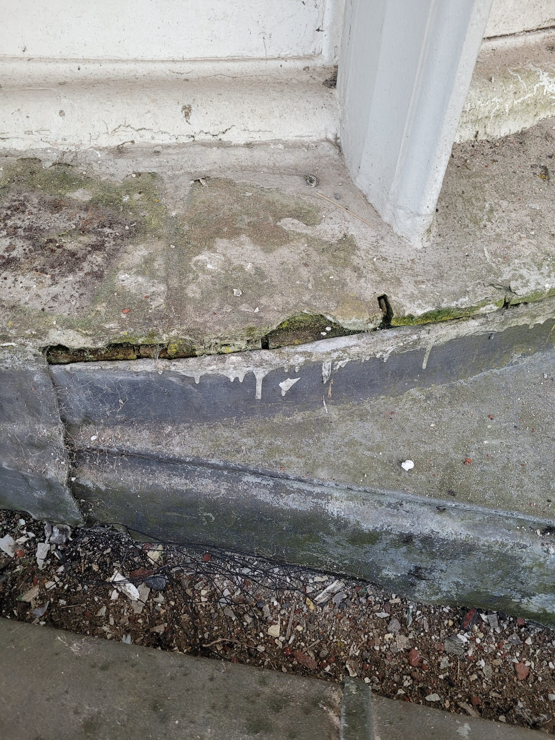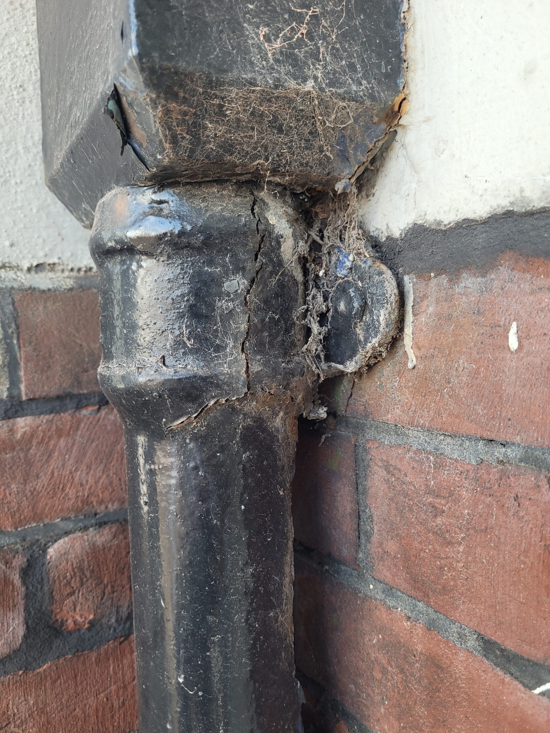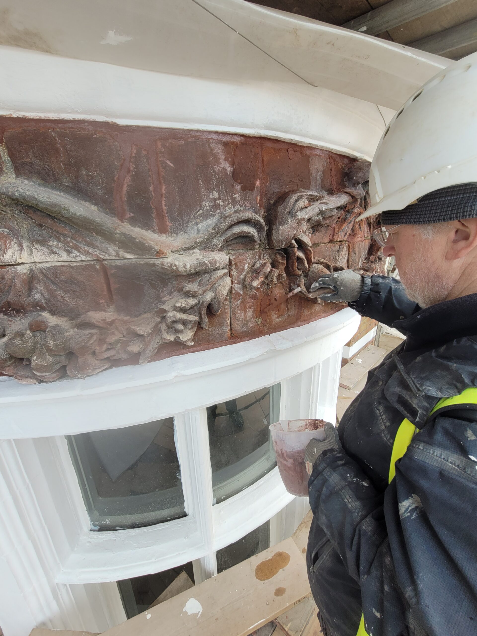 The stonework and terracotta to the front elevation of the building were showing various degrees of decay. The previous paint on the stonework was beginning to peel off, and sections of the stone around the corbels and sills had broken off. They had also used impervious paint to the masonry which had accelerated decay to the masonry. All loose material need tidying up, defrassing and de-vegging. Some joints needed to be raked out and repointed, and terracotta masonry near the bay windows need repairing.