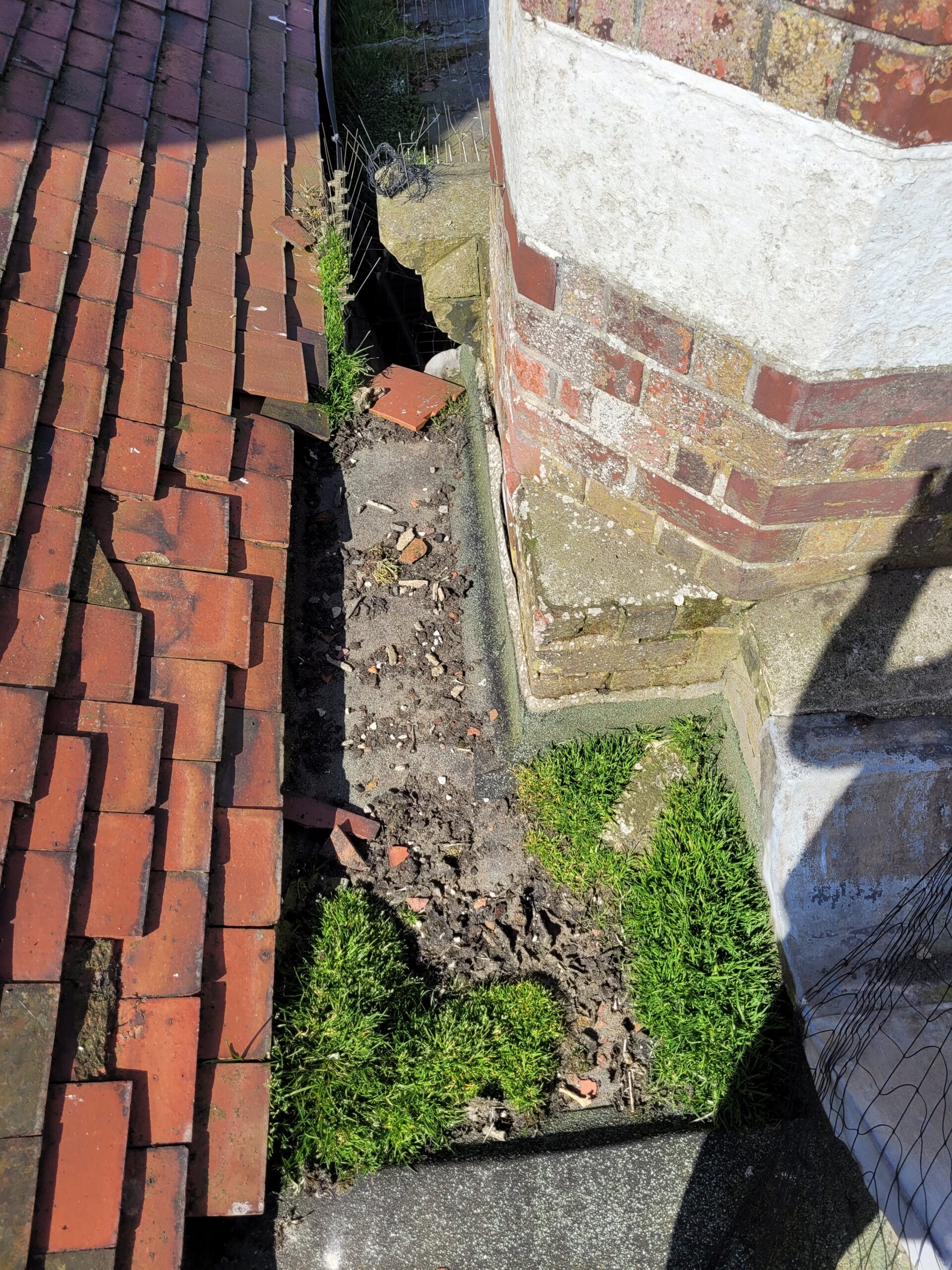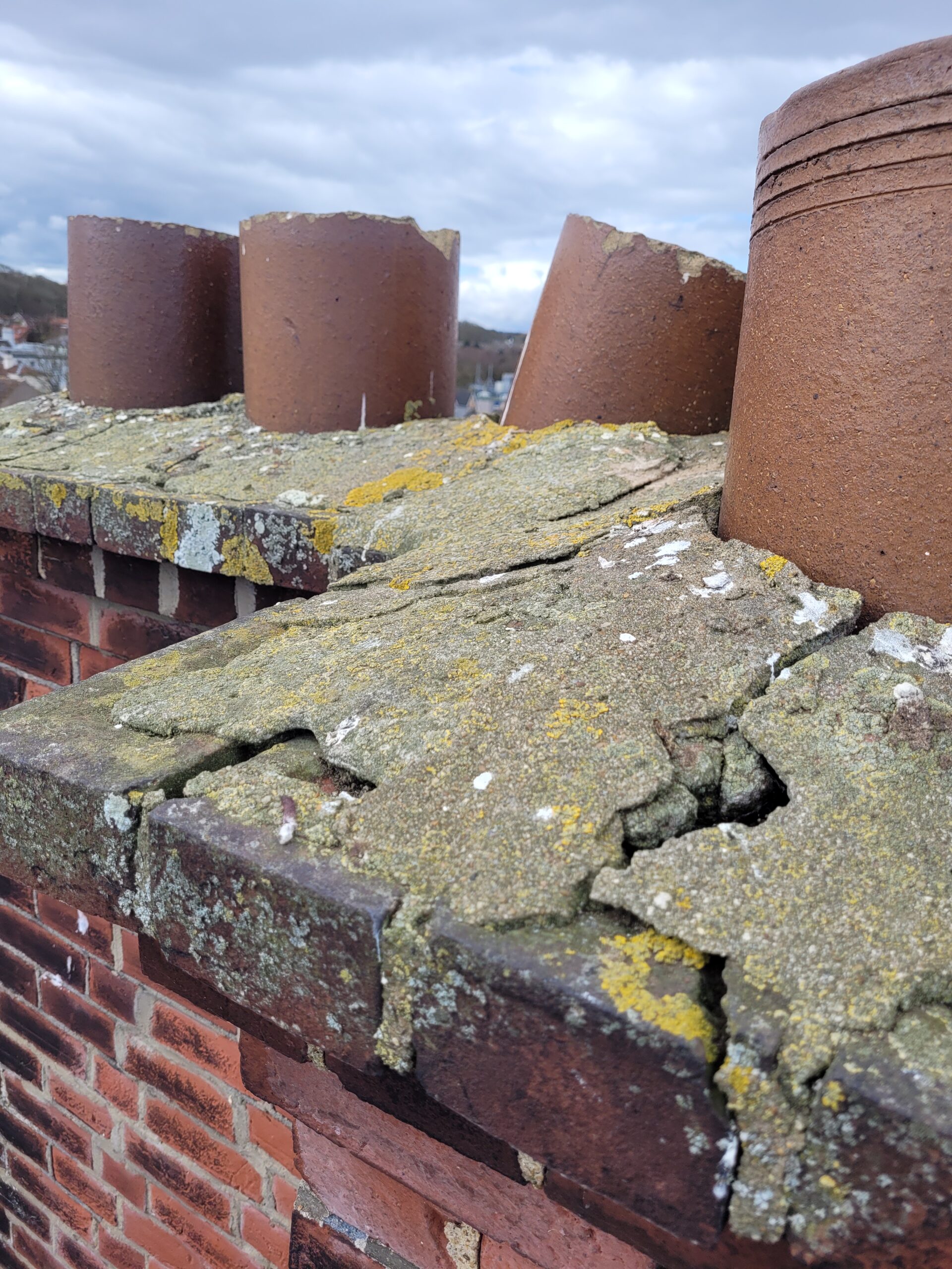 The roof area required quite a large amount of work to the Chimney, Brickwork & Roof tiles. The flaunching on the chimney had cracked, movement to the brickwork had opened up cracks on the chimney flaunching. The brickwork to the chimney had voids allowing water to ingress. Tiles on the roof had slipped and require re-fixing.